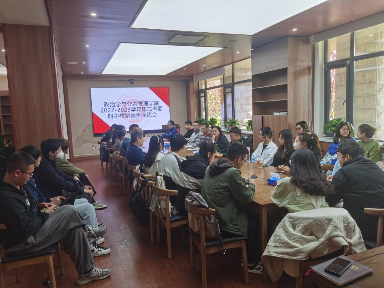 于4月20日在华岗苑南楼一楼新时代美德书屋召开2022-2023学年第二学期期中教学检查座谈会。本次座谈会由学院分管本科教学副院长赵婷老师主持,院本科教学指导委员会老师、院团委书记于玲老师、院本科教务老师及各年级各专业学生代表等参加会议。