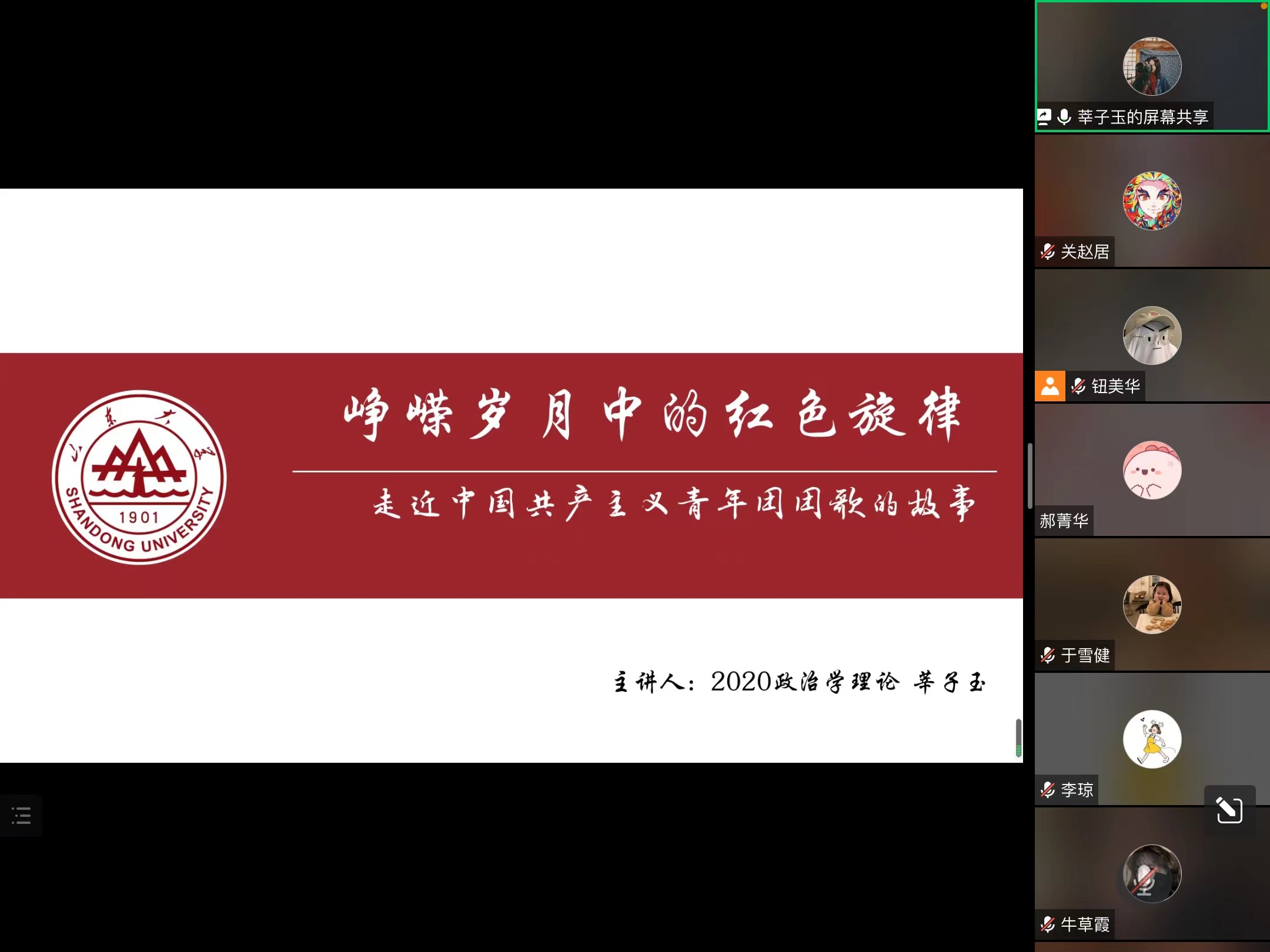 莘子玉同学围绕共青团团歌《光荣啊,中国共青团》分章节展示了这一峥嵘岁月中的红色旋律,包括其创作背景、词曲作者等内容。同时她也对共青团团歌的适用范围和曲调风格进行了补充说明,并与参会的同学们共同赏析了这首洋溢着青春光华的优美歌曲。