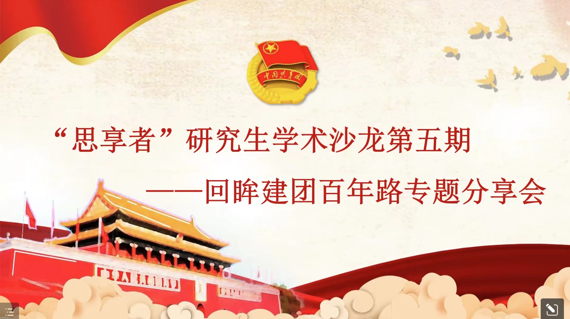 本期“思享者”研究生学术沙龙带领大家深入学习了共青团的百年历史,并围绕团史知识、重要人物等主题进行了分享交流,同学们也在深刻的感悟中通过小程序打卡的方式分享了自己的心得体会。做时代之萤火,谱青春之华章,本次“回眸建团百年路”专题分享活动以建团百年为契机,有利于激励广大青年学习团史,紧密团结在以习近平同志为核心的党中央周围,认真学习和贯彻习近平总书记关于青年工作的重要思想,踔厉奋发、笃行不怠。