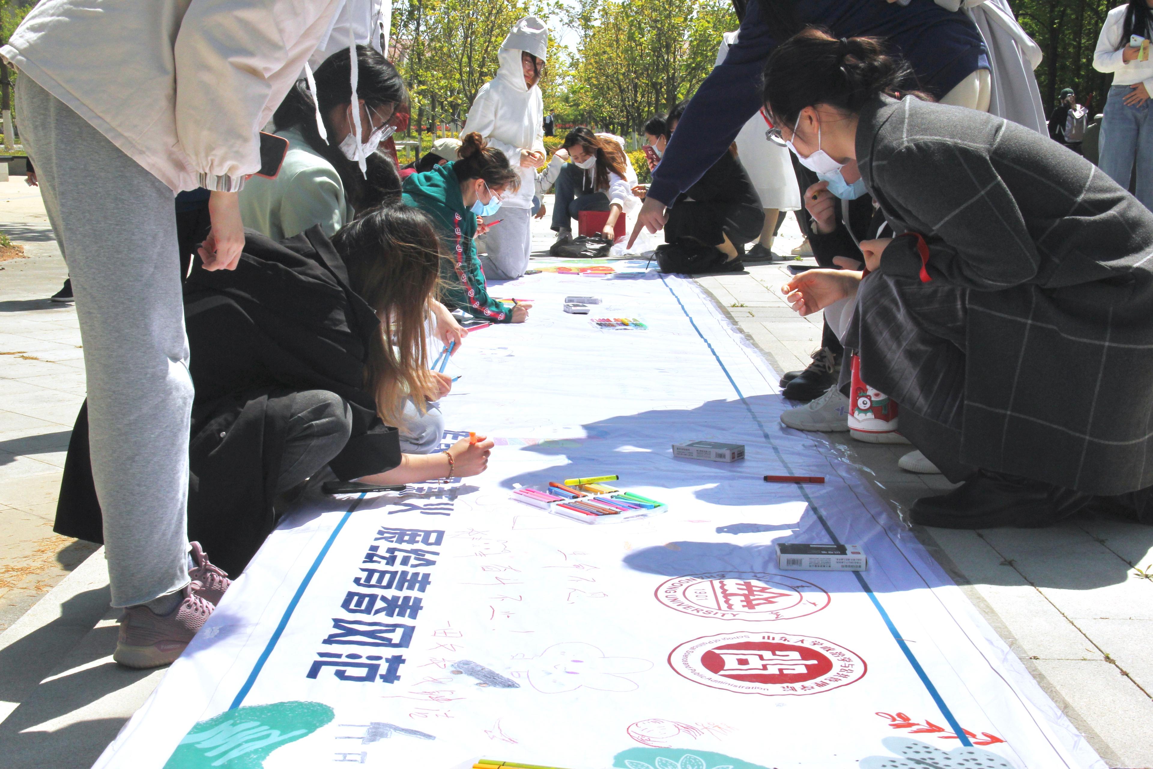 5月4日,微风拂,暖阳照,同学们早早来到活动现场。用画笔和斑斓的色彩,淋漓尽致地展现画工;用热爱和独特的视角,描绘着心中最真诚的祝福;用独具匠心的构思与创意,让祝福搭乘着创意的翅膀在画布上自由飞翔。整个活动现场气氛活跃,吸引了众多同学观看和参与。