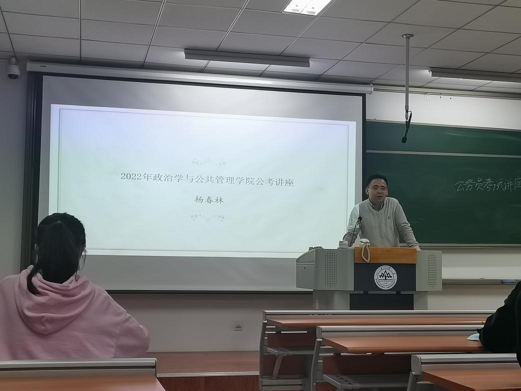讲座伊始,杨春林向同学们介绍了公务员考试的类别、待遇和要求条件。杨春林指出,在考上公务员后,仍要保持一定的应试能力来面对工作中的各种情况。随后,杨春林从当前就业形势入手,就待遇、晋升、稳定性、社会地位和内部制度五个角度深入浅出地讲述了公务员考试的优势和短板。最后,杨春林对公务员考试的报名、笔试、资格审查、面试和体检五个环节以及考察的具体内容进行了详细阐释。