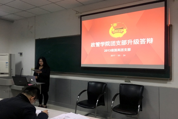 最先答辩的是2015级行政管理班团支部,他们采用视频的展示方式,将采访与活动剪辑成视频,回顾了团支部的不俗表现。2015级国际政治班团支部通过一段“三句半”开场,独特新颖的方式让现场评委耳目一新。2014级国际政治班团支部以“三生三世十里国政”为主题,使用了精美的ppt来展示其风采,给评委及观众留下了深刻的印象。2015级国际政治与英语双学位班团支部将本支部比做村子,“村支书”和“村民委员会主任”用生动的ppt和接地气的语言展示了国英特色。