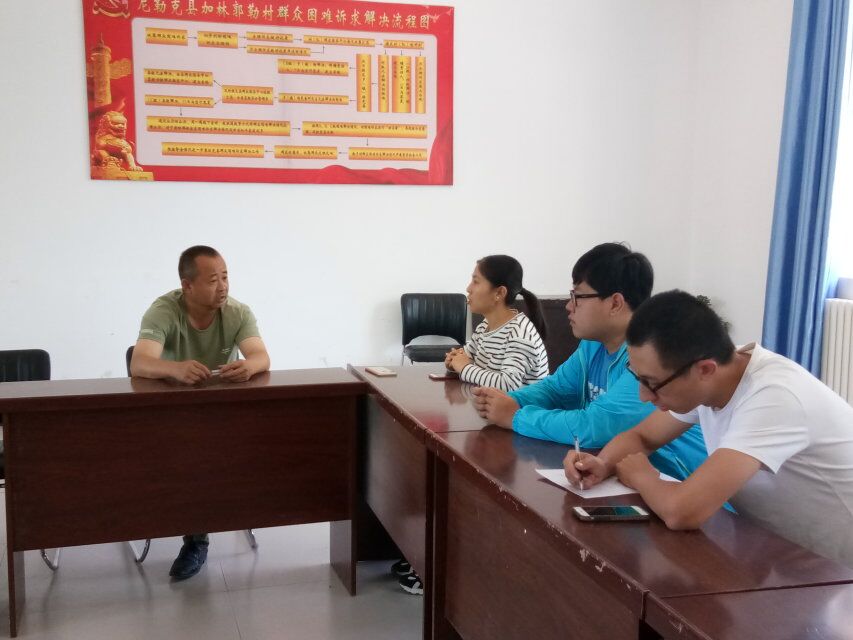 第三日上午,调研小分队一行人到加林郭勒村村委会分发问卷,搜集问卷信息。下午,团队采访了访惠聚工作队副队长谢玉强及一名工作人员。在采访中,谢玉强针对访惠聚工作队在加林郭勒村工作中的具体问题进行了阐述和分析,对工作中遇到的困难也进行了分享,使队员们对访惠聚工作有了不同的认识。