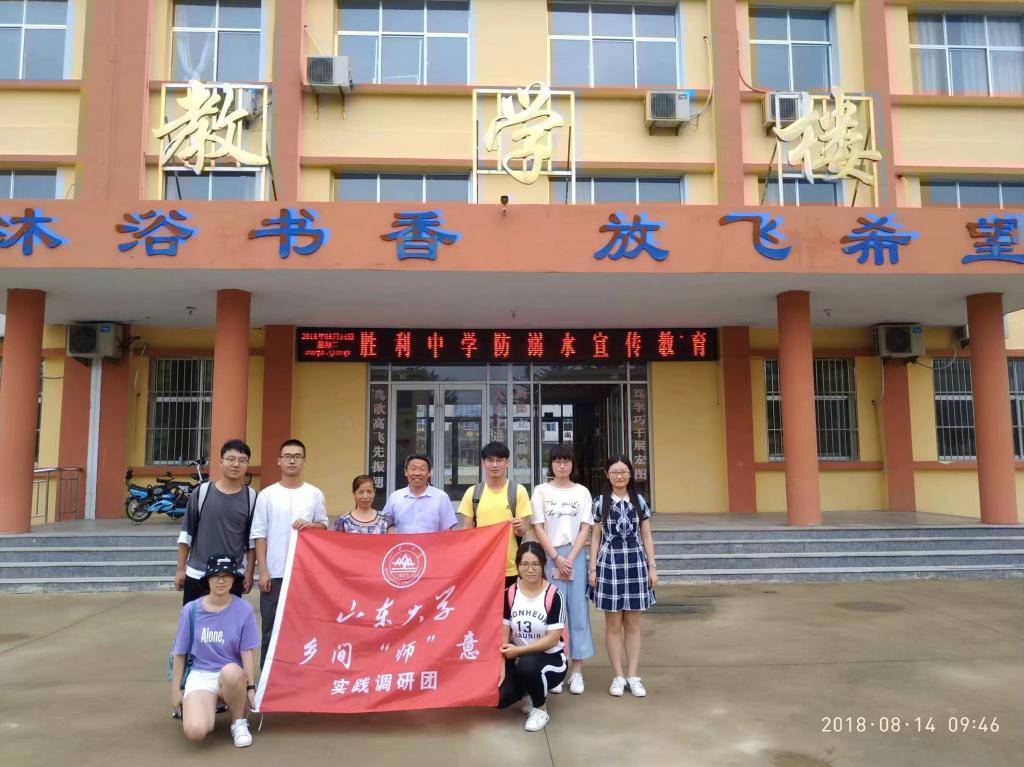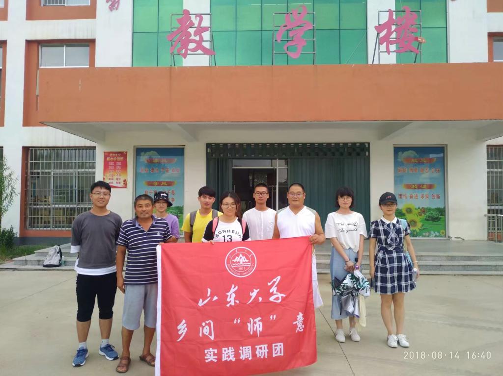 8月14日,队员们开始了正式调研。首先来到了郯城县胜利镇初级中学,杜老师对队员们的到来表示欢迎,带领队员们参观了学校,表示在政策支持下学校的基础设施得到了不断的完善,建起了新的宿舍楼与教学楼等等。随后,队员们分组对学校的六名老师深入访谈,了解了该校教师年龄比例与职称评选相关情况以及学生生源对教师教学的影响等同时也对我们的本次调研提出建议。访谈结束后,队员们向老师们表达感谢并合影留念。