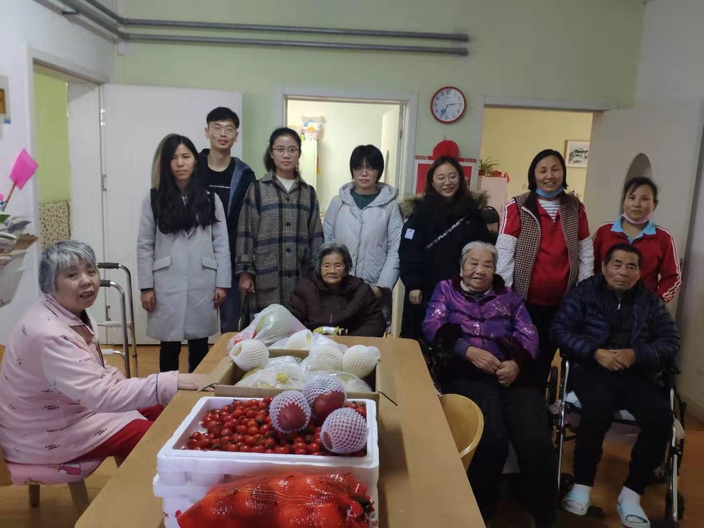 志愿者们的到来为照护中心带了阵阵欢笑声,老少欢聚,其乐融融。老人们纷纷表示,自己在对这里社工老师的悉心照顾非常满意,感谢党和政府能够提供给自己安度晚年之地。一位87岁高龄的奶奶拉着志愿者的手说:“你们只要能来,我们这些老人就非常高兴。你们一定要好好学习,以后要成为国家的栋梁!”在得知专业班级已有多名同学顺利通过入党相关的培训与考试后,爷爷奶奶们纷纷竖起了大拇指。