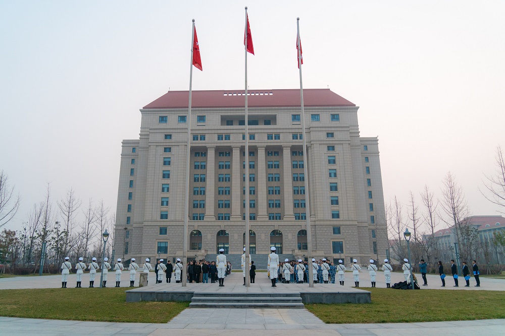 上午7点,青岛校区国旗班随着“出旗!”一声令下,迈着整齐的步伐护送国旗来到旗杆下,升国旗仪式在嘹亮的国歌声中正式开始。鲜艳的国旗缓缓升起,现场师生向国旗行注目礼,齐声高唱国歌,现场气氛肃穆而庄重。