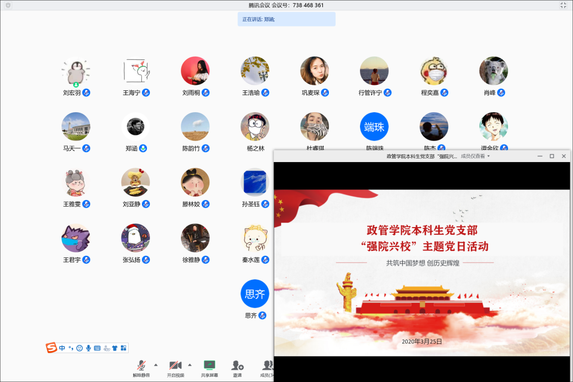 本科生党支部通过线上会议成功开展了“强院兴校”主题党日活动,同志们在前期个人自学的基础上,就以下三个问题进行了深入交流,分别为:我为“强院兴校”建言献策;深入学习十九届四中全会精神心得体会;大学生党员如何为抗击疫情做贡献。