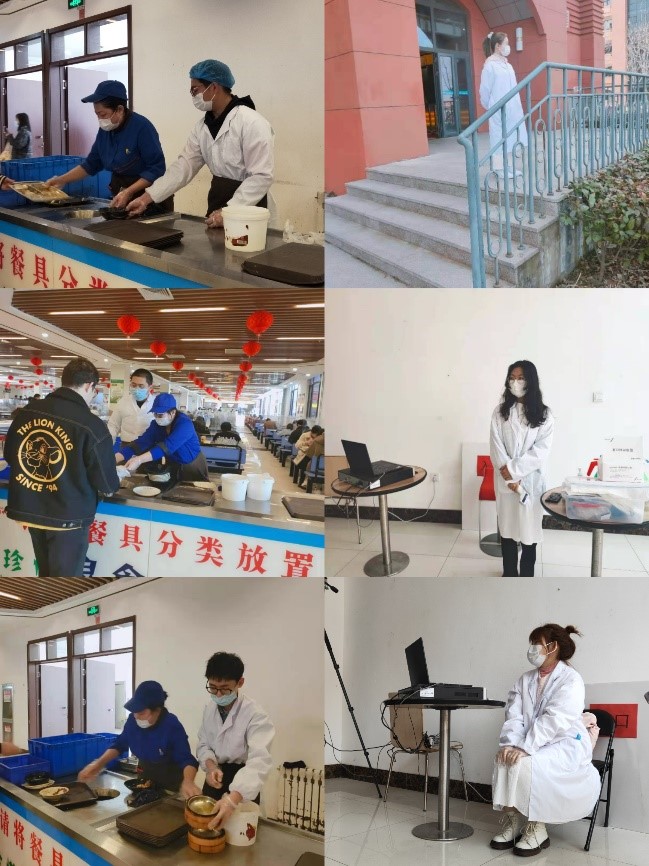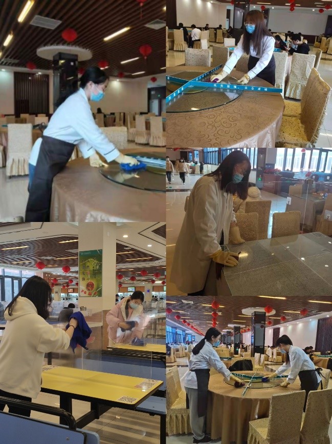 3月12日,活动负责人与食堂主任进行商议,将志愿者分为两组,以求更有效率地开展活动。志愿者们按照分工,分布在食堂一楼和三楼,从收拾碗筷到擦拭桌板,从监控测温到收纳餐盒,每一件小事都亲临食堂工作者的真实环境 。