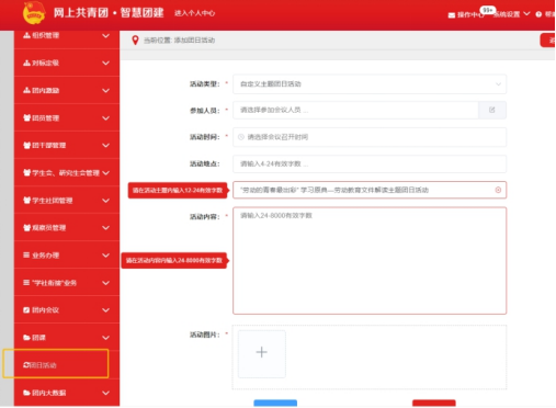 委员会关于全面加强新时代学生劳动教育的行动方案>的政策解读》PPT文件,以团支部为载体,对其进行领读学习,对精神内涵进行宣传解读,推动文件政策到每个团支部、每个成员。各支部学习劳动教育文件情况以支部为单位于12月6日前录入智慧团建系统“团日活动”板块,具体录入流程:“团日活动”、“活动发布”、“确定”,活动类型为“自定义主题团日活动”,活动主题为“劳动的青春最出彩”学习原典—劳动教育文件解读主题团日活动。