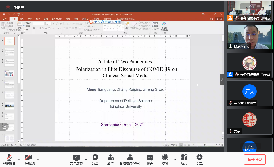 信息科学与工程学院教授李玉军作了题为《面向特殊群体的司法大数据研究进展和思考》的发言,从司法大数据进展介绍、司法裁判文书分析技术、服刑人员风险评估技术三个方面进行讲解和梳理,并结合四个案例进一步分析大数据在司法领域中的重要作用。最后,李玉军教授指出司法大数据是国家提升综合治理能力和平安中国建设的重大需求,是计算社会科学的重要应用领域,也欢迎更多的青年才俊参与这个领域。孟天广发言的主题为“A Tale of Two Pandemics:Polarization in Elite Discourse of COVID-19 on Chinese Social Media”,将意识形态极化置于中国背景下进行探讨。他指出,新冠疫情期间,虽然知识阶层中的意识形态有着极化的趋势,但是整体舆论呈正能量的状态。