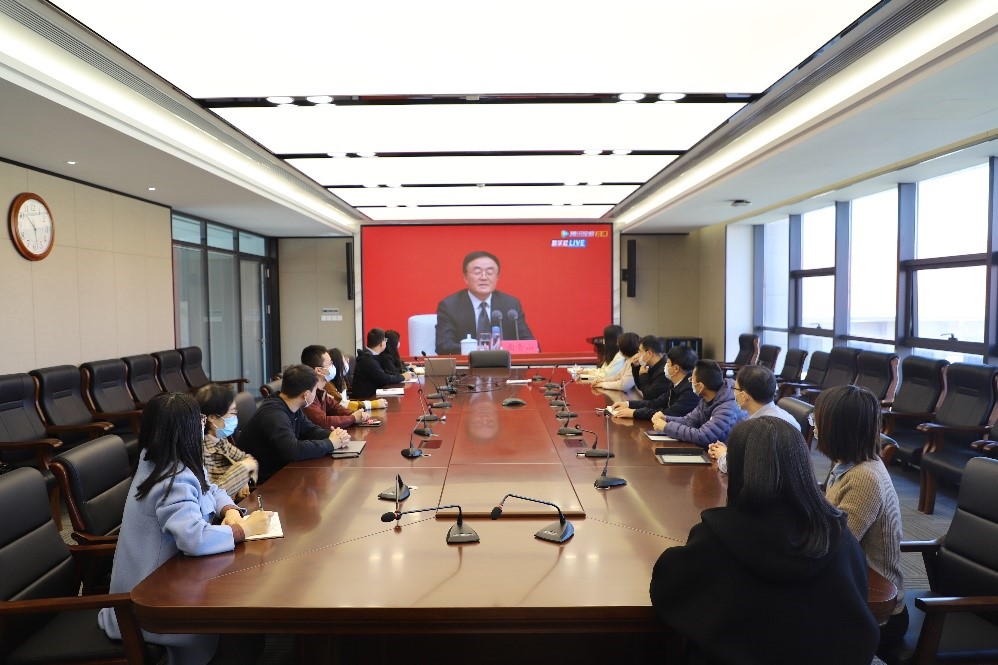 在华岗苑南五楼中厅会议室组织教工集中收看了党的十九届六中全会新闻发布会,同时学院各党支部以各种形式组织师生收听收看发布会直播。