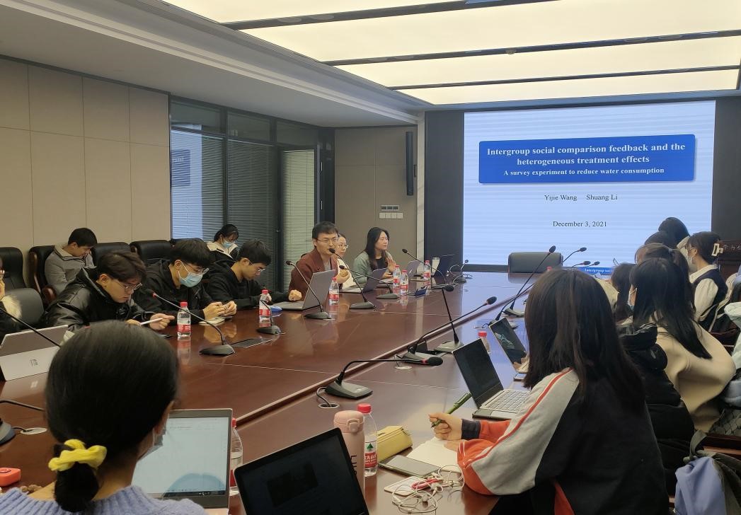 讲座中王乙杰老师以自己的一项研究《社会比较可以有效促进居民节约用水吗:一项调查式实验研究》向大家介绍了调查式实验法的具体操作以及用实验法写一篇学术论文应注意的一些细节问题。研究分析了组间社会比较信息在促进居民节约用水方面的作用。显示与其他条件相比,在提供组间社会比较信息的情况下,居民节约用水的意愿明显提高。并进一步研究了用水习惯和比较强度对干预结果的调节作用。这一研究的结果验证了社会比较方法在节水领域的效果。