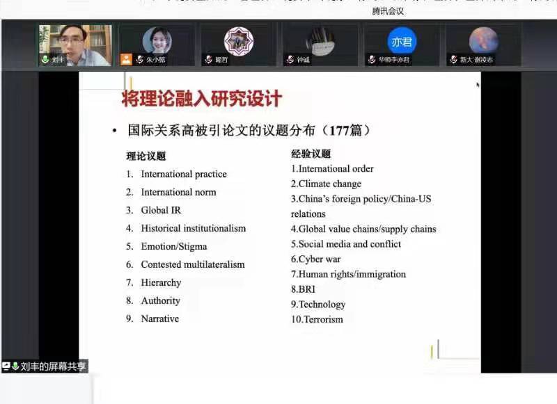 接下来刘丰教授谈了研究设计要素和标准,他指出,研究设计实际上是进行研究规划,包括研究问题、文献综述、理论框架、经验分析、研究发现五个部分。刘丰教授引用著名期刊International Security的判断标准,即原创性、挑战传统观点、讨论重大问题、有生命力以及可读性这五个要素作为判断研究优秀与否的重要指标。然后,刘丰教授介绍了理论思维与研究设计。他建议研究者探寻现实世界中现象、行为和结果的显著差异,寻找理论与经验的明显脱节之处,将理论与经验进行对照;他认为可以介入几种理论之间的重大争论,弄清不同理论之间的逻辑链条和观察方式,再进行比较;他还指出也可以补充已有理论遗留的有限缝隙,找出现有理论明显忽略或遗漏的其它方面。
