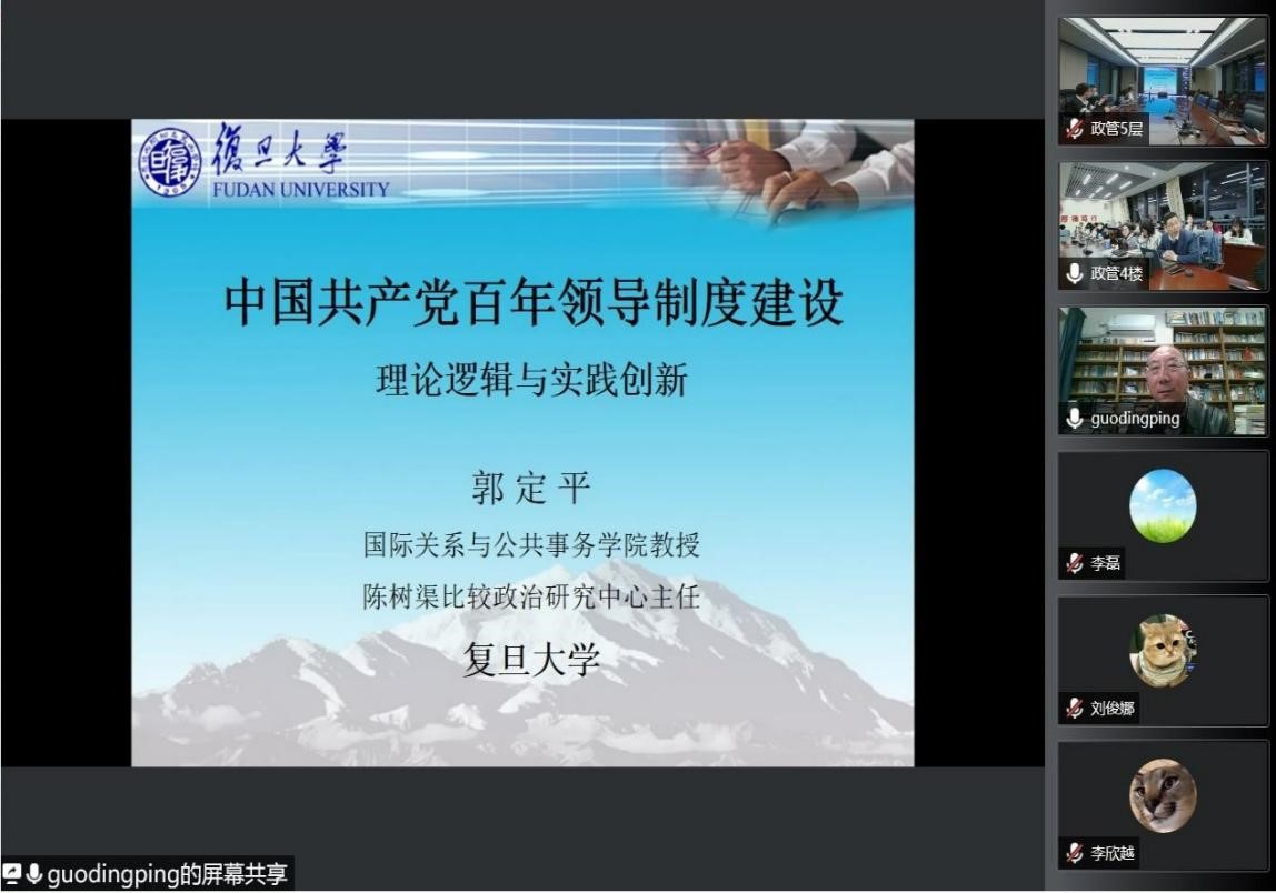 12月8日晚,复旦大学国际关系与公共事务学院郭定平教授应邀作了题为“中国共产党百年领导制度建设的理论逻辑与实践创新”的线上讲座。讲座由av视频