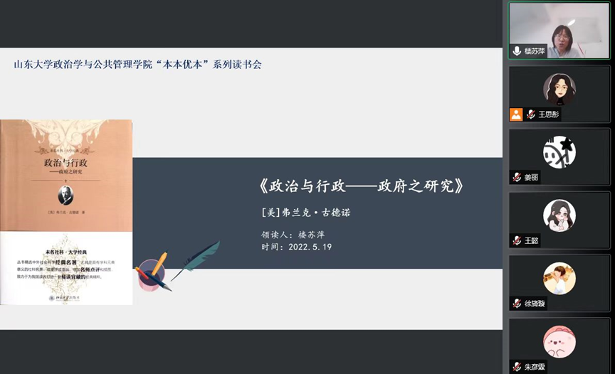5月19日晚,公共管理系第一期读书会于线上举行,楼苏萍老师带领学生阅读《政治与行政——政府之研究》,该书为现代公共行政学领域的开山之作,标志着西方公共行政学独立于政治学的开端,是公共行政专业的必读经典。读书会中,楼苏萍老师介绍了作者生平,并由“什么是政治与行政”、“行政与政治的关系为何”、“政治与行政之协调的工具是什么”和“政党在政治与行政中扮演着什么角色”这四个问题串联进行内容讲解,并在最后就“为什么称本书为论述现代中国政治问题的新书”这一观点进行了讨论。
