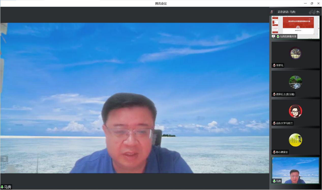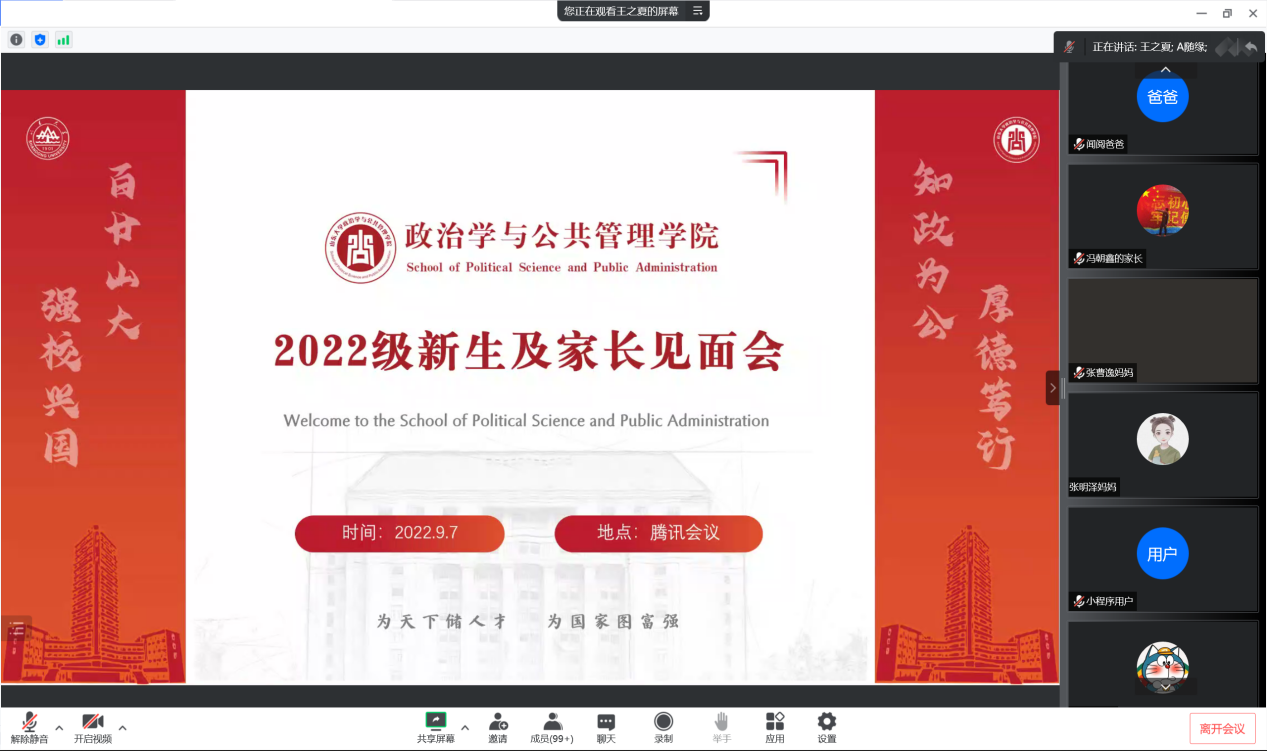 2022级新生及家长见面会于线上举行。学院党委书记盖玉强,常务副院长马奔,副院长刘昌明、党委副书记马桂兰、副院长朱贵昌、副院长赵婷,政治学与行政学系系主任李振,公共管理系系主任楼苏萍,团委书记于玲,辅导员臧丽丽以及2022级全体新生和新生家长参加此次见面会。会议由2022级辅导员王之夏主持。