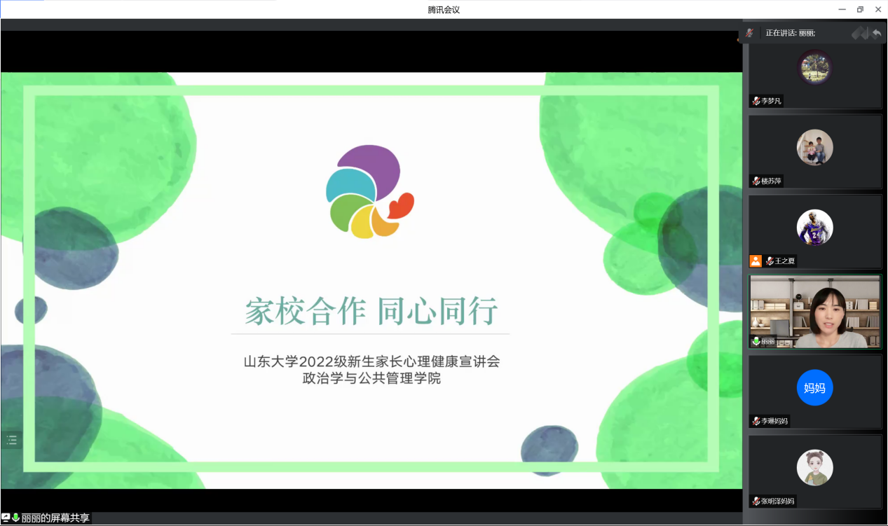 最后,学院辅导员臧丽丽作了题为“家校合作,同心同行”的心理健康宣讲会,为家长介绍了学生进入大学可能面临的常见问题,并向家长们讲述了与新生沟通的方法——尊重、倾听、理解、支持。臧丽丽还介绍了学生心理健康教育与咨询中心,展示了学院为新生开设的心理相关课程及系列讲座、宣传活动等。