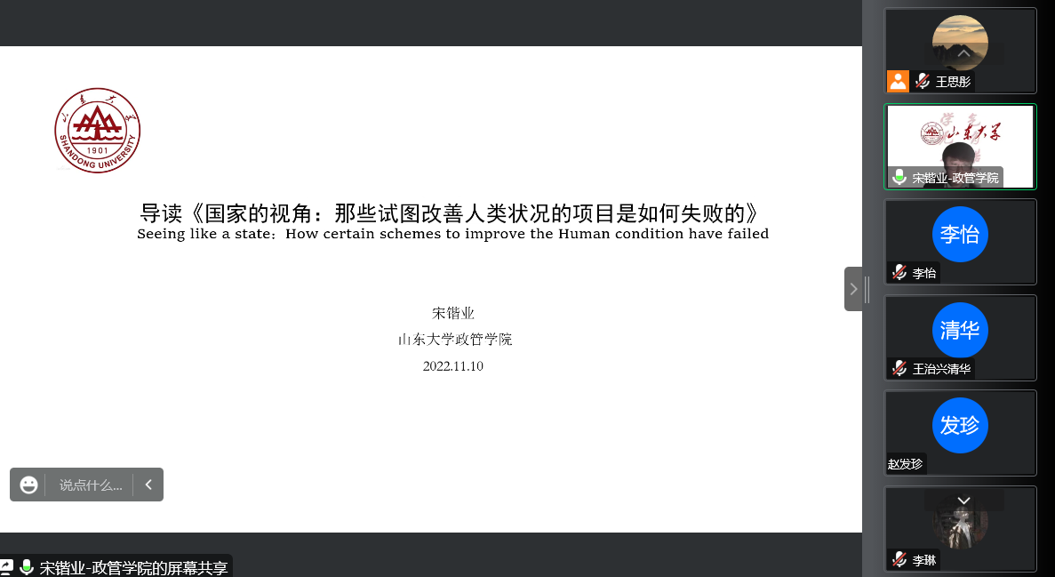 公共管理系本学期第二期“本本优本”读书会于线上举办。本次读书会导读书目为《国家的视角:那些试图改善人类状况的项目是如何失败的》,由学院助理研究员宋锴业领读,学院各年级三十余名本科生参与。