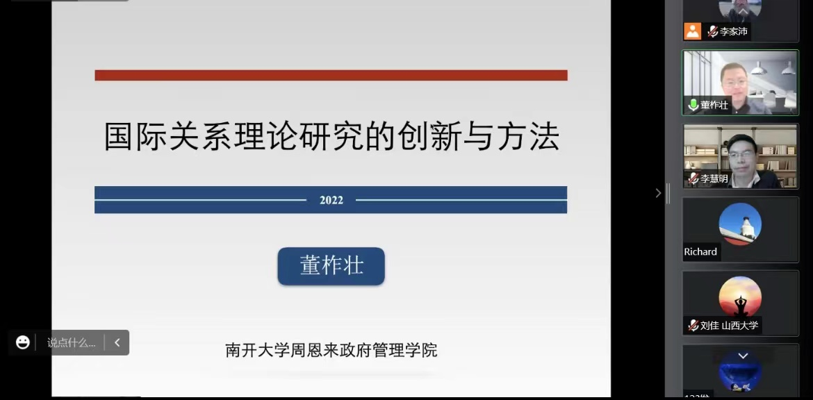 2022年11月25日,山大国政博士生学术工作坊第二期于线上成功举办。南开大学周恩来政府管理学院讲师董柞壮以“国际关系理论研究的创新与方法”为题进行了精彩讲座。av视频