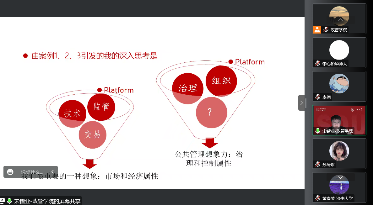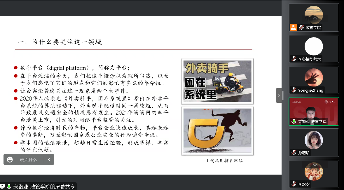 公共管理系本学期第五期望远青年学者沙龙于线上召开,本场讲座主题为:数字平台与公共管理研究想象。讲座由学院助理研究员宋锴业主讲,学院助理研究员李欢欢担任主持人,一百余名学生积极参与。