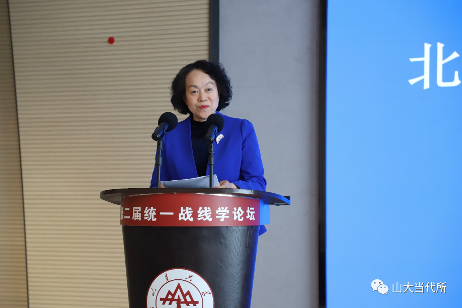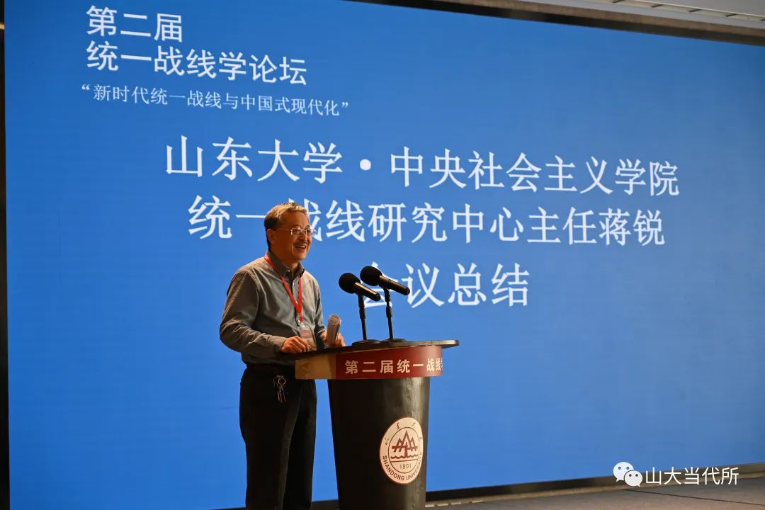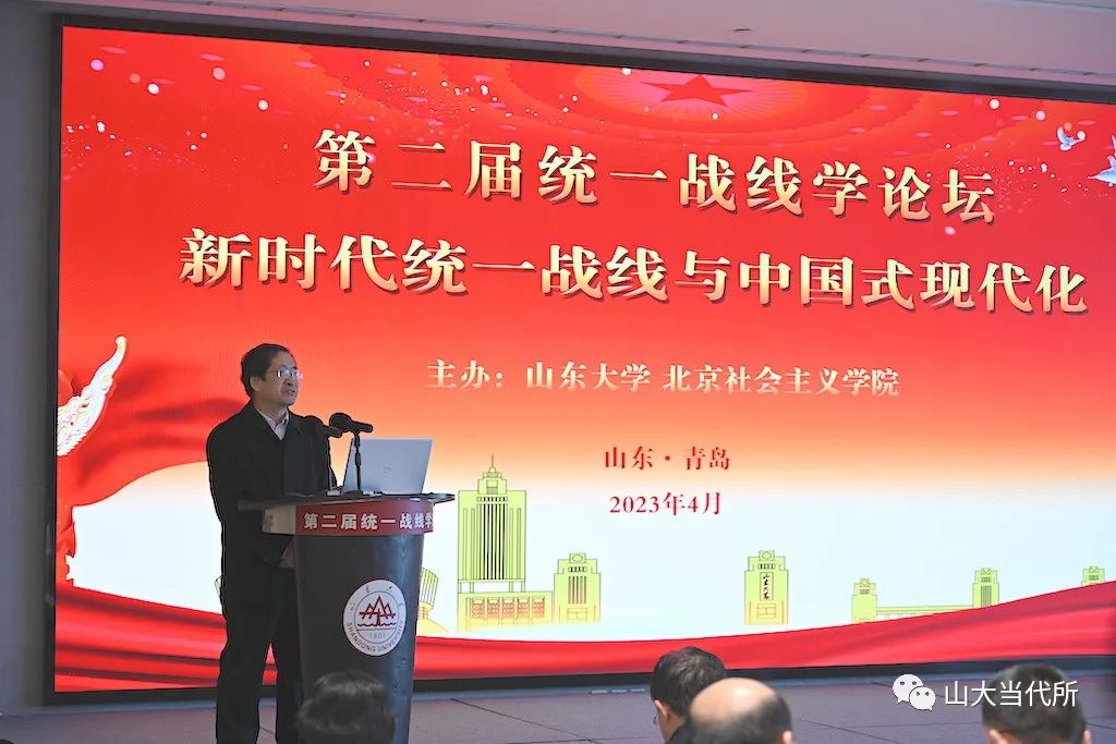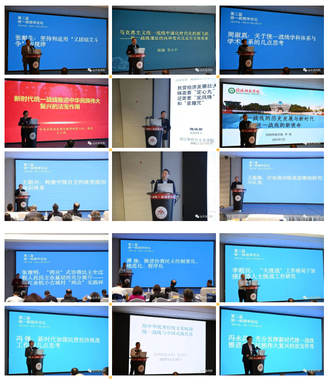 马克思主义学院教授王韶兴倡导积极构建中国自主的政党政治知识体系;湖南省社会主义学院教授周述杰分析了统一战线与全过程人民民主的逻辑契合与现实演绎;中共青岛市委统战部一级巡视员王振海认为,应加强对统战思维的研究与认知;浙江省社会主义学院一级巡视员张建明以浙江余杭小古城村“两众”实践样本为例,分析了“两众”式协商民主对全过程人民民主在基层的充分展开;中共山东省委党校教授谭建阐释了如何推进协商民主制度化、规范化、程序化的问题;湖南师范大学马克思主义学院教授李超民解读了“大统战”工作格局下如何加强网络人士统战工作;山东社会科学院马克思主义研究院研究员冯锋分享了他对新时代加强民营经济统战工作的思考;贵州师范大学教授张荣军阐述了如何用中华优秀传统文化赋能统一战线,以更好地服务于中国式现代化;山东省社会主义学院教授冯永昌围绕充分发挥新时代统一战线推进中华民族伟大复兴的法宝作用发表了自己的见解。