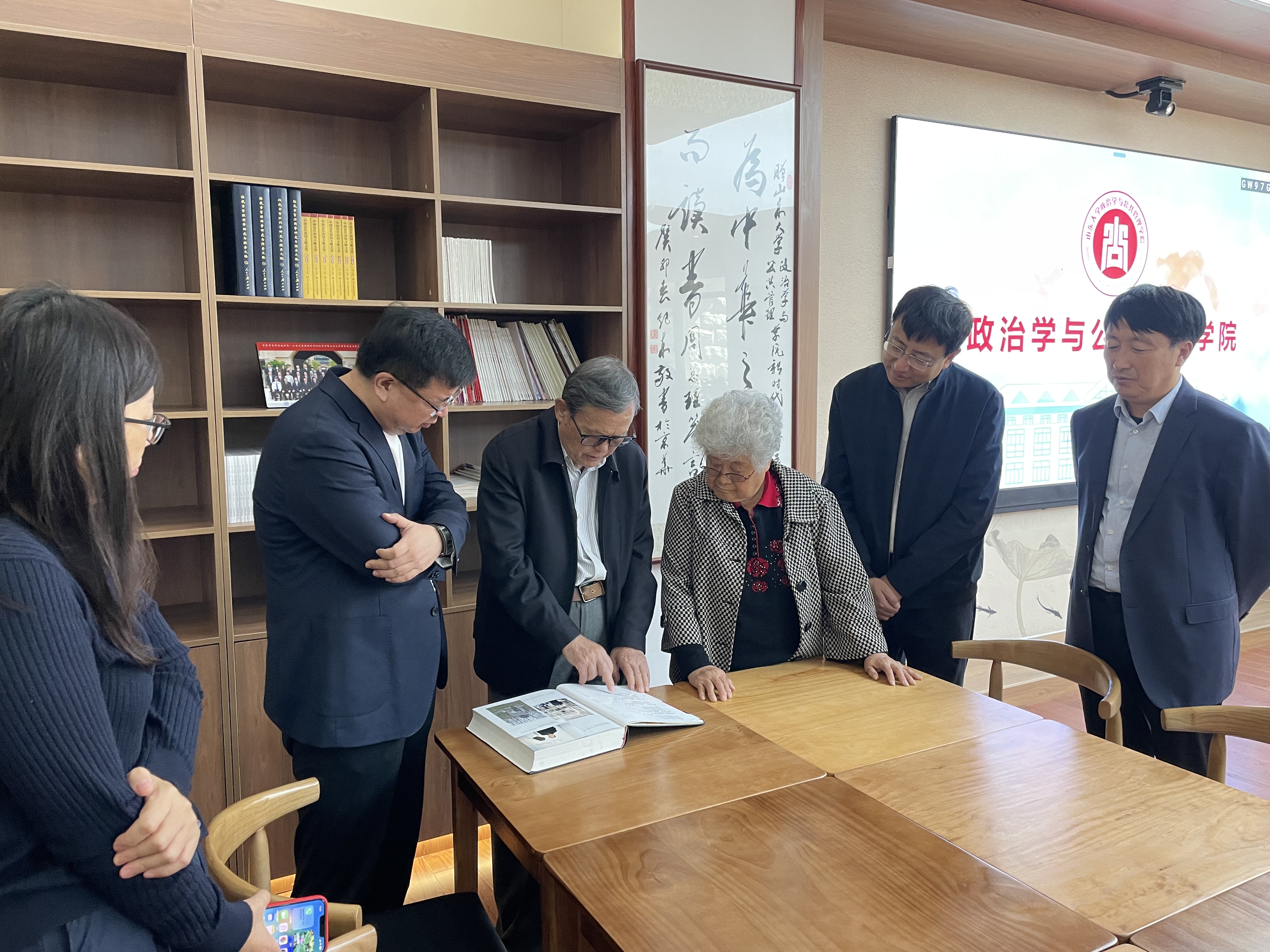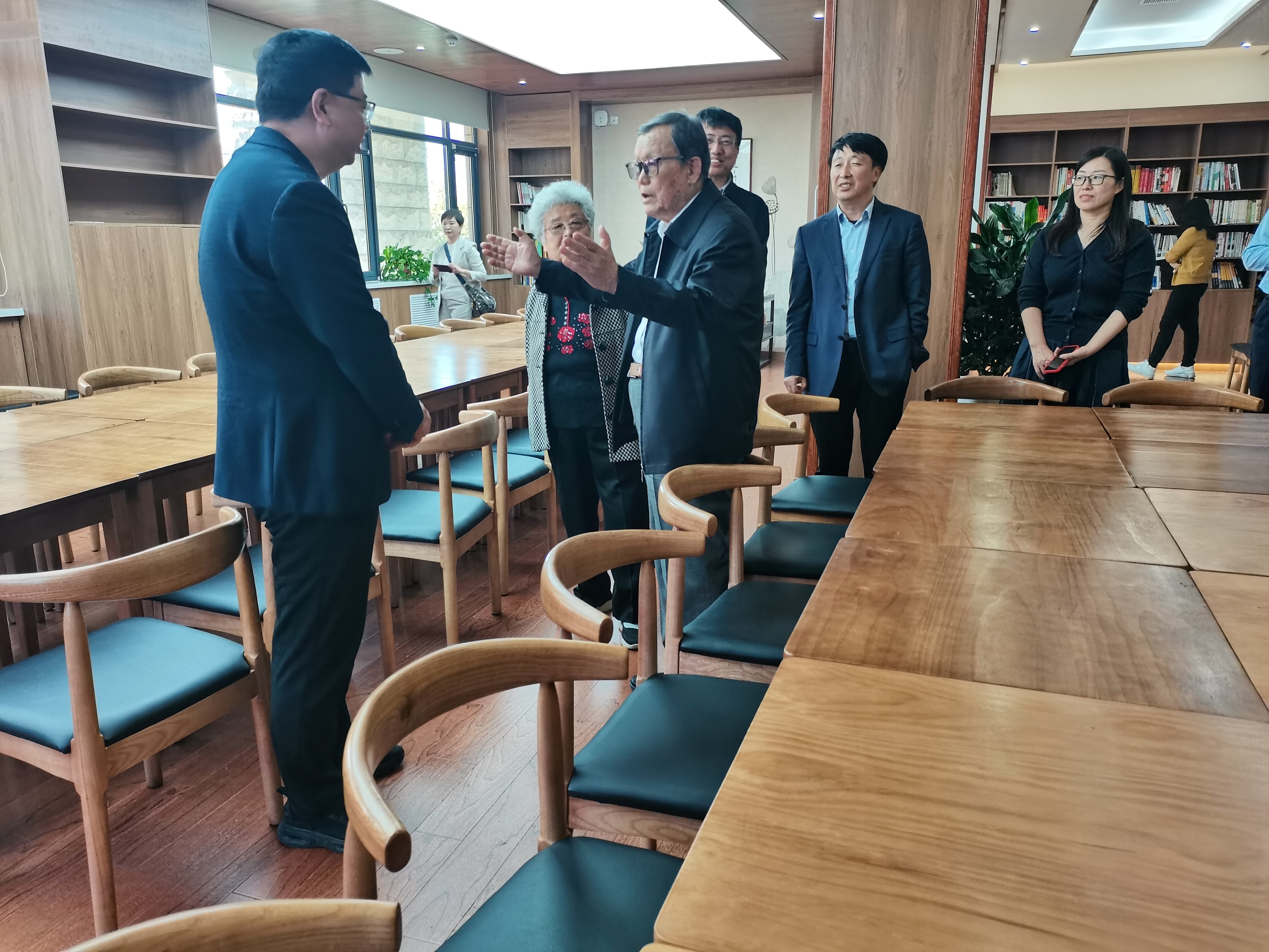 回到学校,孙钱章教授亲切地称呼大家为校友,对于母校的款款深情溢于言表。手抚着书架上其所捐献的《孙钱章管理科学研究与探索之路》和《中国历代治国方略文选》等系列书籍,孙钱章教授介绍了其早年治学的经历以及开创中国管理科学的艰辛历程,真可谓筚路蓝缕、嘉惠学林。随后,孙钱章教授讲述了其积极为国育才的二三往事趣闻,幽默的语言中蕴含着深刻的道理,体现出老山大人对于“为天下储人才,为国家图富强”办学宗旨的不改初心。