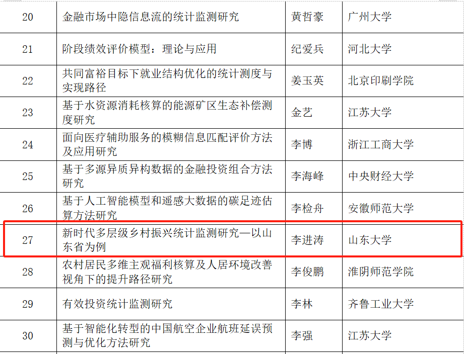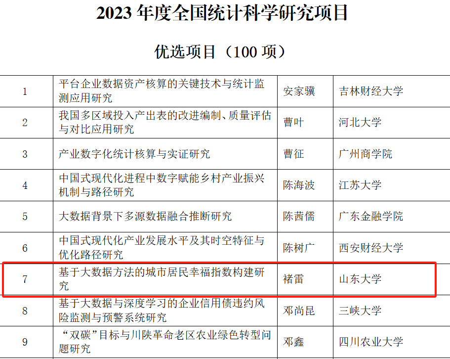 日前,全国统计科学研究组织管理办公室公布了2023年度全国统计科学研究项目立项名单。av视频 生活质量与公共政策研究中心副主任、专任研究员李进涛的《新时代多层级乡村振兴统计监测研究—以山东省为例》、中心专任研究员褚雷的《基于大数据方法的城市居民幸福指数构建研究》获批优选项目。此次全国统计科学研究立项充分彰显了中心服务地方与决策支持的新型智库作用。