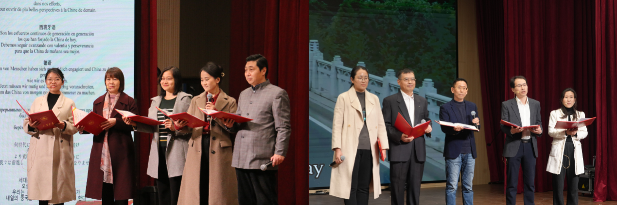 在第三篇章中,演奏《大鱼》带师生感受旋律之美,领略千年沉淀的国风妙音;舞蹈《杯盏念归家》以优美舞姿传递心意,愿杯盏归家、家国永安;歌曲《成全》在动人旋律中找寻成长的意义;学院10位老师用英语、法语、德语、西班牙语、俄罗斯语、日语、韩语带来的朗诵《这就是我,中华人民共和国》让人心潮澎湃,以家国情怀绘就每位av视频