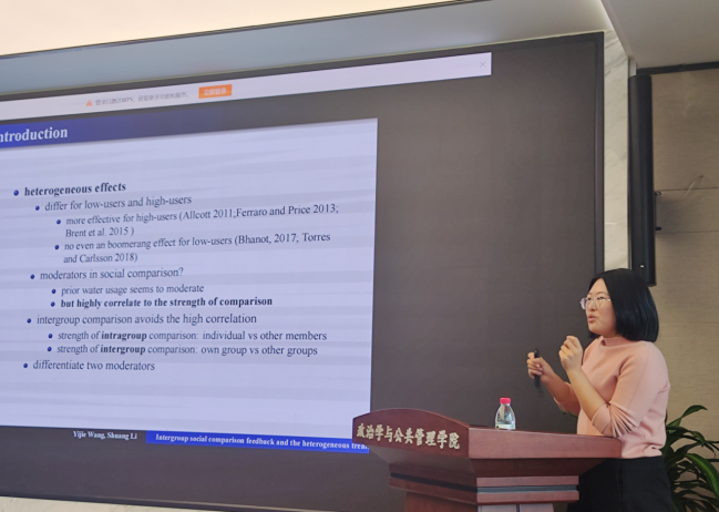 王乙杰老师作了题为“Intergroup social comparison feedback and the heterogeneous treatment effects:a survey experiment to reduce water consumption”的报告,主要研究组间比较信息对居民节水意愿的影响,发现在提供组间比较信息时居民节约用水意愿明显提高,还分析了用水习惯和干预信息的强度对干预结果的调节作用。