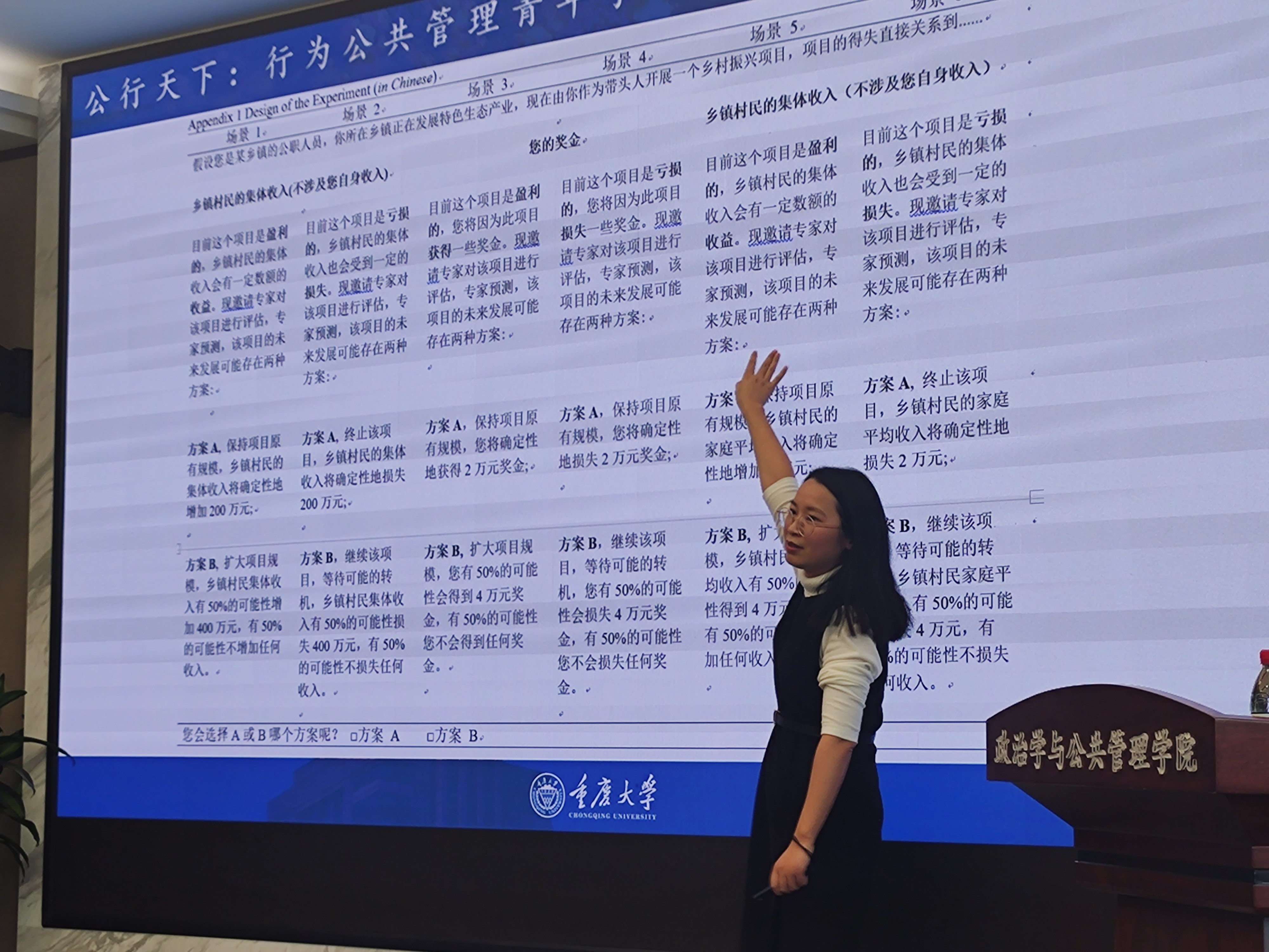 黄晴老师“风箱中的老鼠何去何从:双重压力下街头官僚亲社会违规行为倾向——一项调研实验研究”的报告将研究对象定为面对向上执行和向下回应双层压力的基层公务员,用“2×2”组间设计分析在“压力-反弹”逻辑下,受组织考核、被执法者利益损失、社会风险等因素影响,街头官僚将如何价值表达和行为选择。