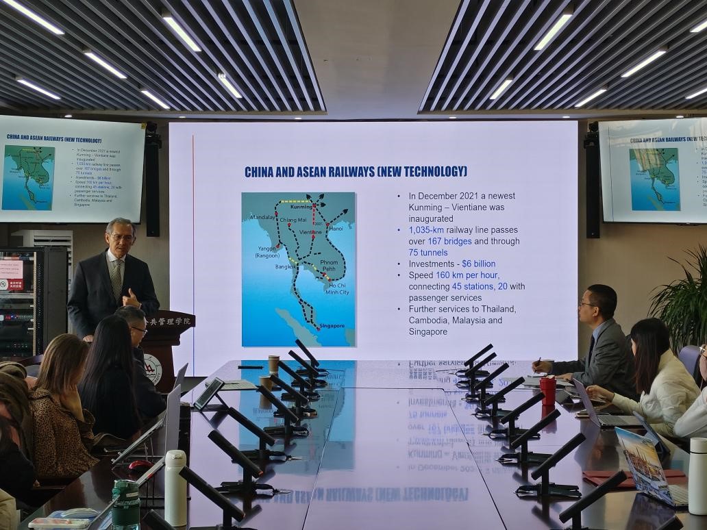 讲座伊始,Djoomart Otorbaev教授介绍了自己关注中国研究的原因。结合实际观察,他对全球化背景下“一带一路”倡议的必要性予以高度评价,强调十年来“一带一路”倡议成效显著,推动了中亚地区基础设施建设。中吉乌铁路即为典例:它在大大缩短中国与欧洲之间的距离的同时,也有力促进了地区双、多边贸易的蓬勃发展。盛力教授认为Djoomart Otorbaev教授为中国学者进行欧亚研究提供了不同的视角。