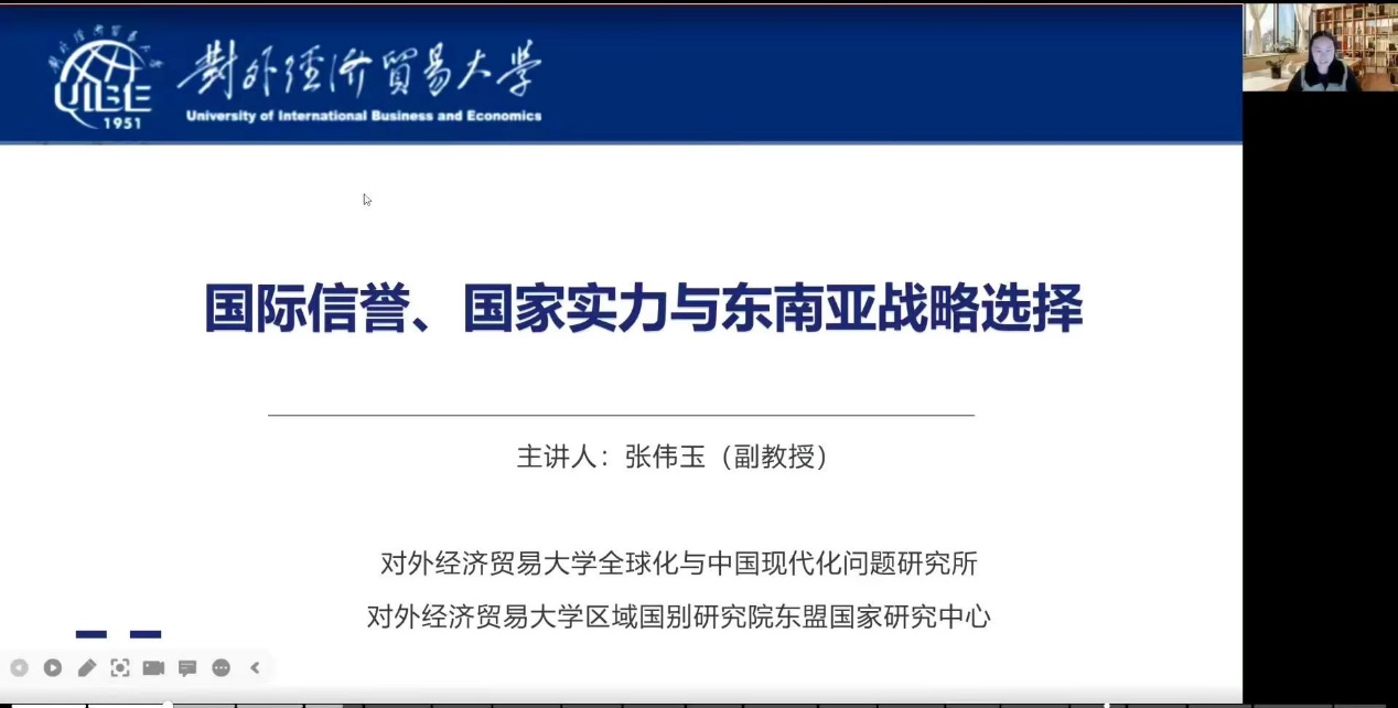 亚太经济合作组织研究中心承办的“社科与人文”系列讲座第二十三讲在线上顺利举办,讲座题目为“国际信誉、国家实力与东南亚战略选择”,由对外经济贸易大学张伟玉副教授主讲。av视频