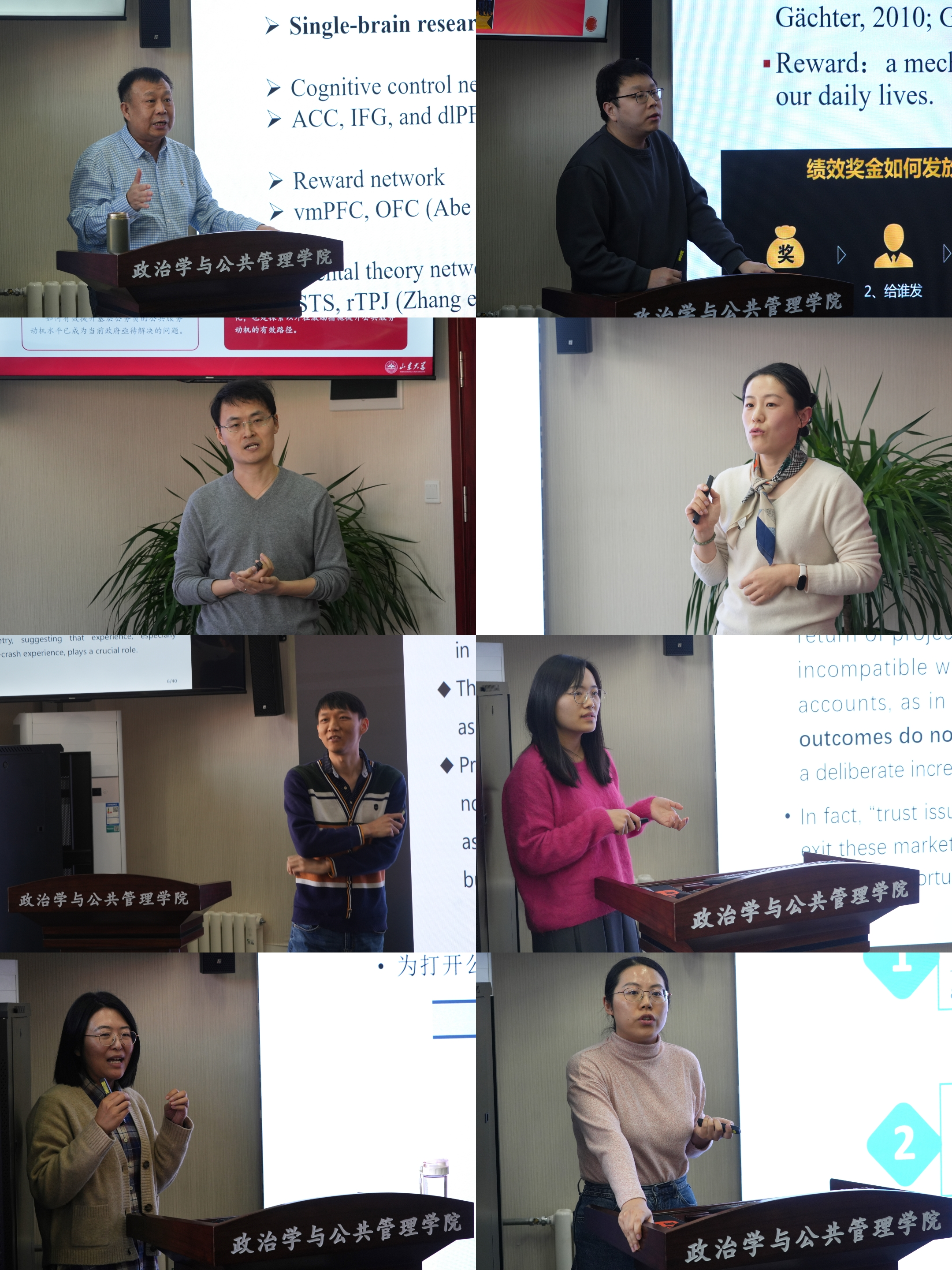 副教授刘华兴做了题为《外在激励如何影响基层公务员的公共服务动机水平?——一项调查实验研究》的报告,通过调查实验的方法分析外在激励影响基层公务员公共服务动机水平的机理。经济学院副研究员牛晓飞做了题为Pro-cyclical Learning Asymmetry: Evidence from Financial Professionals的报告,分析了投资者在股票市场牛熊经济周期中学习和信念的不对称性,揭示了泡沫破灭经验在金融市场投资中的重要作用。公共治理研究院助理教授王乙杰做了题为《行为公共管理与实验室建设》的报告,从研究框架、研究方法和研究探索三方面介绍了行为公共管理的主要内容和发展趋势。