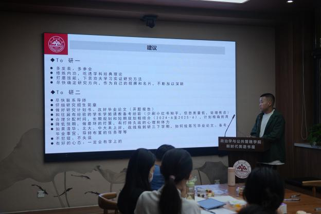 在优秀毕业生分享环节中,2021级硕士研究生席嘉诚就申博问题与同学们进行了分享和充分交流。在择校方面,要关注院校学科实力、导师选择、奖助政策、自身简历匹配等方面。随后,席嘉诚详细介绍了博士申请考核流程,并从笔试和面试两个方面给出备考建议。最后,他建议研究生同学吃透学科经典理论,学习实证研究方法,尽早确定自身研究方向,尝试发表学术论文,积极参加学术会议。