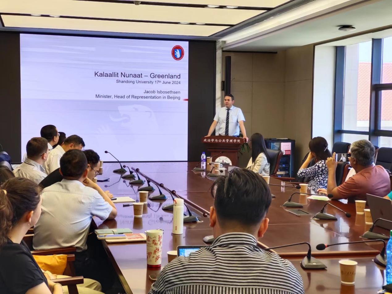 讲座伊始,Jacob Isbosethsen介绍了格陵兰岛作为世界上最大的岛屿的基本情况。接着,他对格陵兰岛的文化与人口、外交政策、经济发展状况、旅游状况等情况进行了详细的介绍,为在场师生更深入地了解格陵兰岛提供了全面的视角。在此基础上,他也重点阐述了气候变化对格陵兰岛来说是个机遇的观点,这为我们关于气候变化产生影响的认知提供了一个新的视角。同时Jacob Isbosethsen对中格合作以及合作过程中青岛发挥的独特作用进行了介绍。呼应Jacob Isbosethsen精彩的演讲,盛力教授认为,尽管中格相隔很远,国际局势风云变化,但双方仍可以齐心协力、相互理解,进一步加强合作交流。