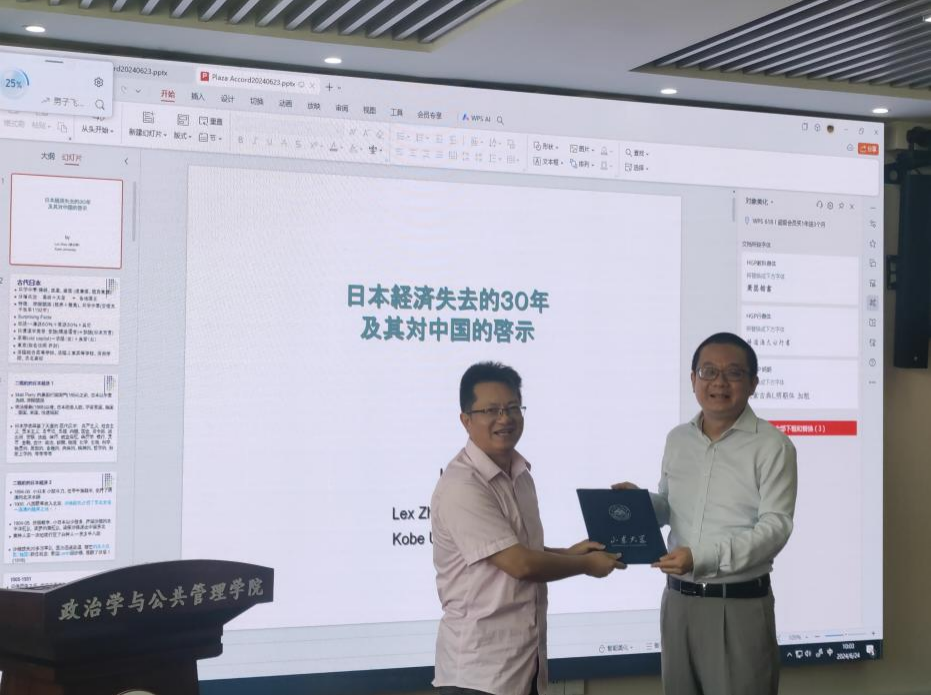 讲座伊始,赵来勋教授首先对日本经济发展的历程进行了全面的梳理,着重追溯了《广场协议》签署的历史脉络,并对该协议对美日两国产生的深远影响进行了深入剖析。随后,赵来勋教授结合自身经验,对日本当前及未来面临的挑战进行了系统性的分析和展望。盛力教授指出赵教授的精彩演讲有助于我们全面了解日本的经济历史与现状。杨鲁慧教授亦表示,赵来勋教授的研究不仅填补了区域国别经济研究的空白,也为大国崛起背景下中国的经济自主战略选择提供了有益的启示。
