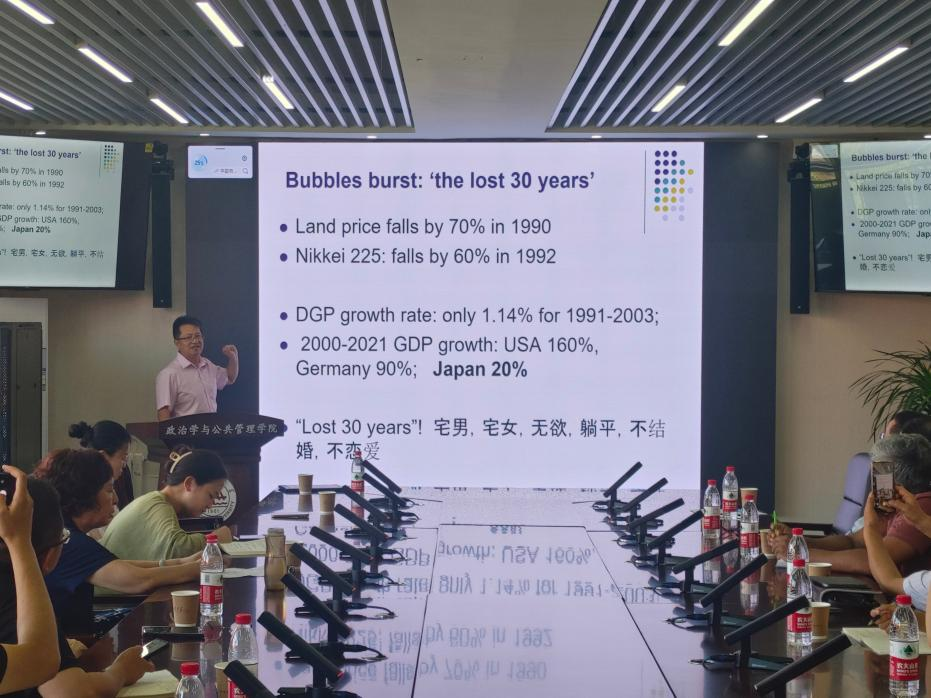 在互动交流环节中,师生们围绕日本失落的三十年对中日韩自贸区谈判的影响、日本泡沫经济对基本公共服务政策的影响、新一轮美联储加息下日元大幅贬值对日本经济复苏的挑战等问题展开讨论。讲座最后,盛力教授对本次会议进行了总结,并再次对赵来勋教授的精彩演讲表示感谢。
