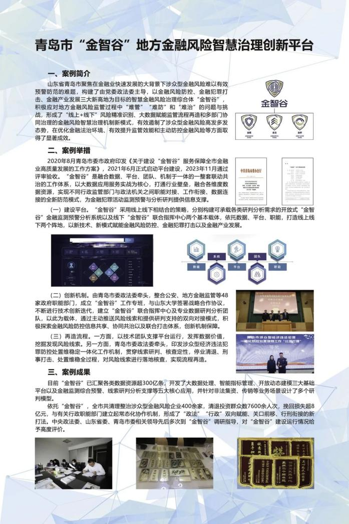 智慧国家治理实验室参与共建的青岛市“金智谷”地方金融风险智慧治理创新平台成功入选2024全国政法智能化建设智慧治理典型案例。