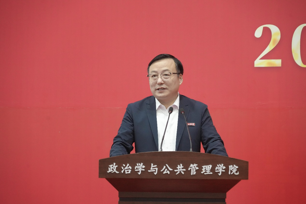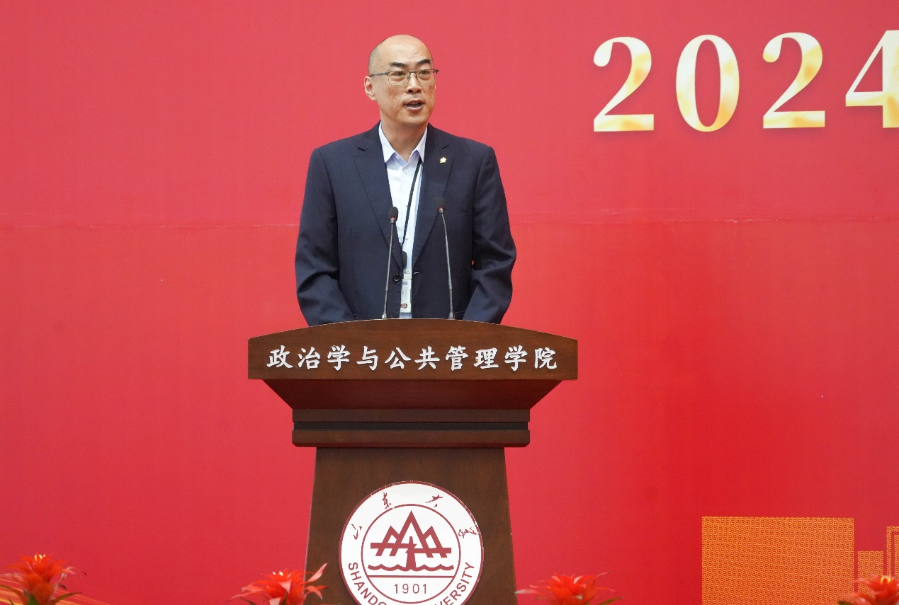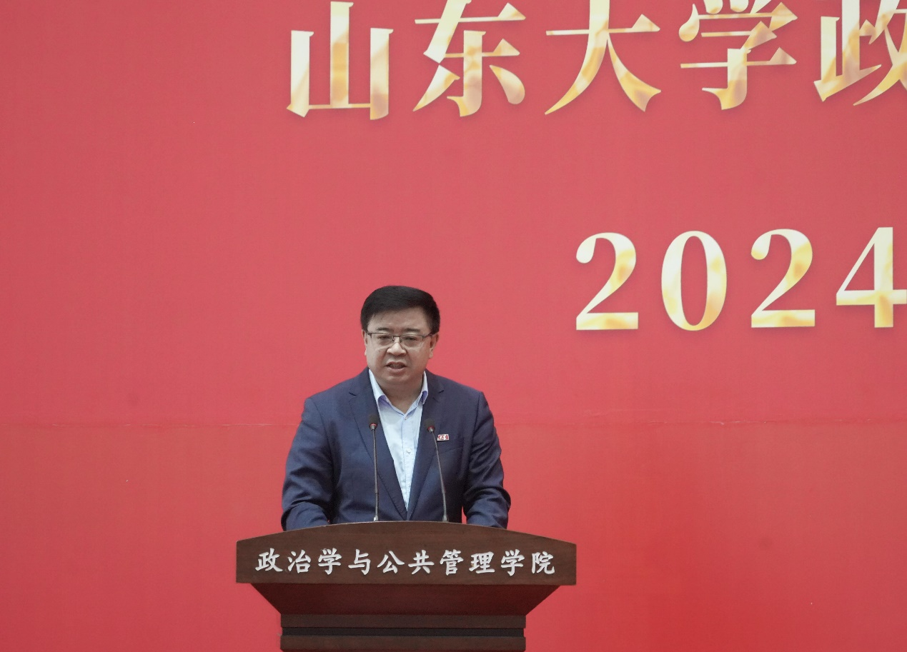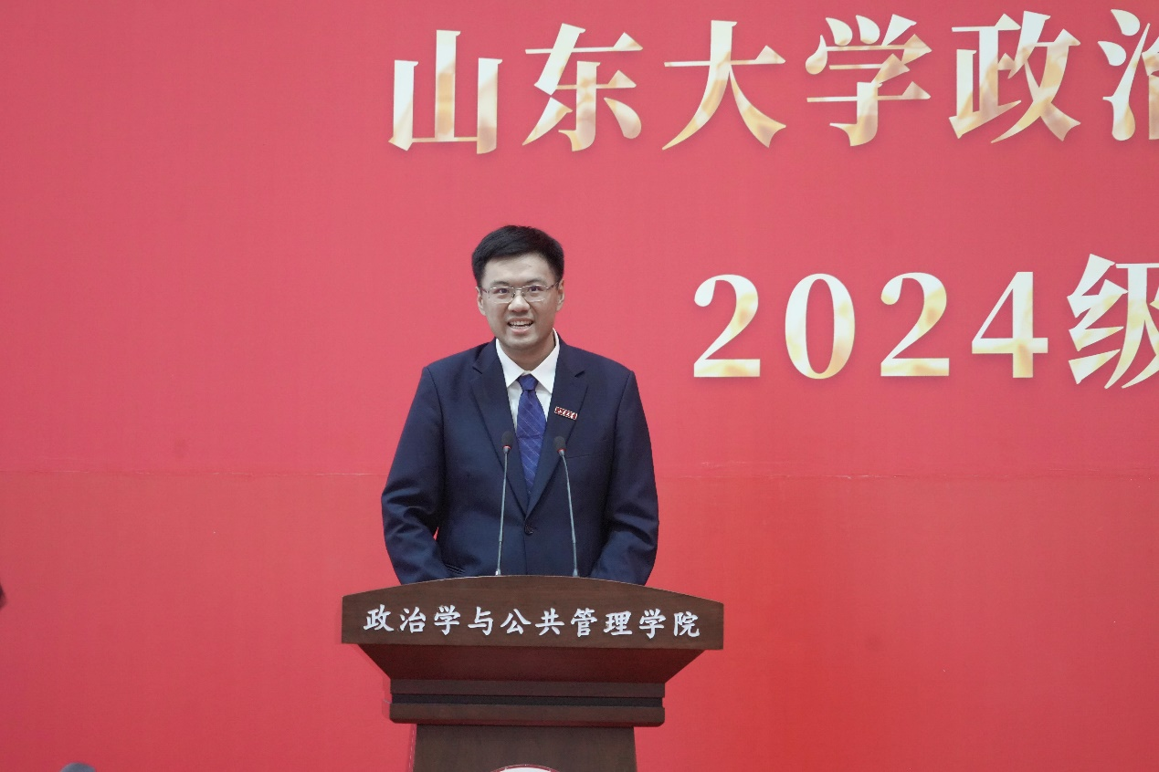 的发展历程以及现阶段取得的成果。他讲到,山大从1901年起源至今已发展了123年,其中分别在二十世纪三十年代和二十世纪五十年代拥有了两次辉煌,而今天的新生们承载着创造山大第三次辉煌的重任。他嘱托新生们运用好学院和学校的平台,贯彻“知政为公,厚德笃行”的院训和“为天下储人才,为国家图富强”的山大办学宗旨,将个人发展与实现中华民族伟大复兴的中国梦结合起来,抒写新时代的精彩华章。