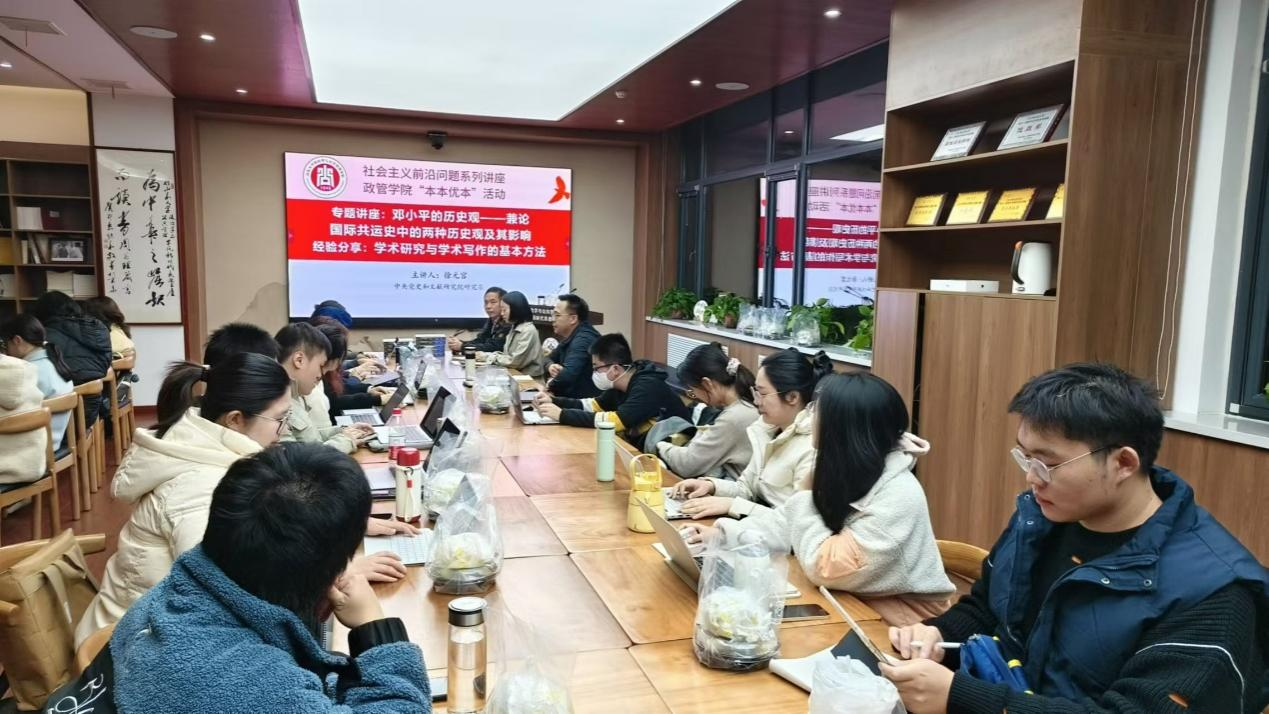 “本本优本”活动暨社会主义前沿问题系列讲座于青岛校区华岗苑南楼新时代美德书屋举办。本期包括“邓小平的历史观——兼论国际共运史中的两种历史观及其影响”为主题的专题讲座和“学术研究与学术写作的基本方法”的经验分享两部分,由中央党史和文献研究院研究员徐元宫主讲,av视频