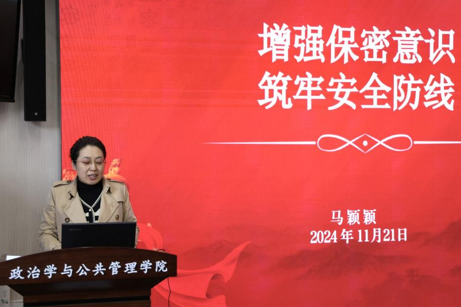 保密工作办公室副主任、青岛校区党工委(校长)办公室副主任马颖颖为学院教工进行培训指导,培训会由学院党委副书记石莹主持。