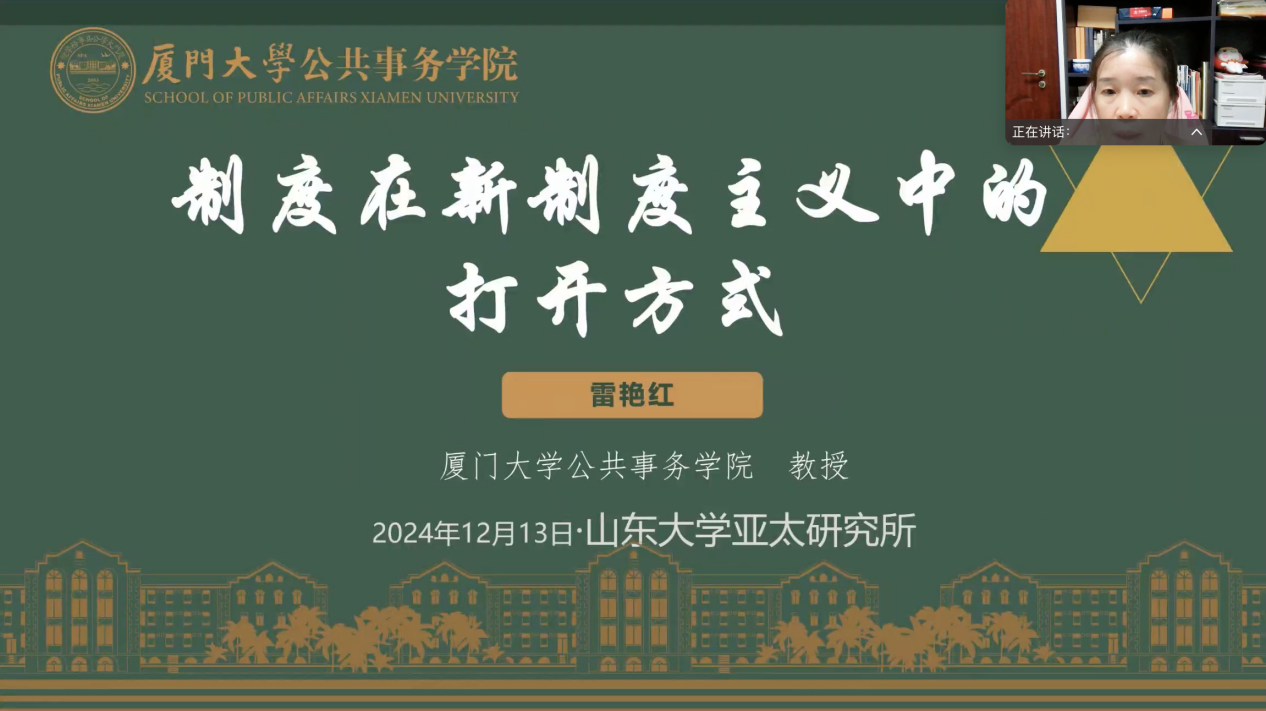 亚太研究所主办,亚太所亚太国家社会与人文研究中心承办的“社科与人文”系列讲座第三十一讲在线上举办,讲座题目为“制度在新制度主义中的打开方式”,由厦门大学公共事务学院教授雷艳红主讲,亚太所副所长钟诚主持,av视频