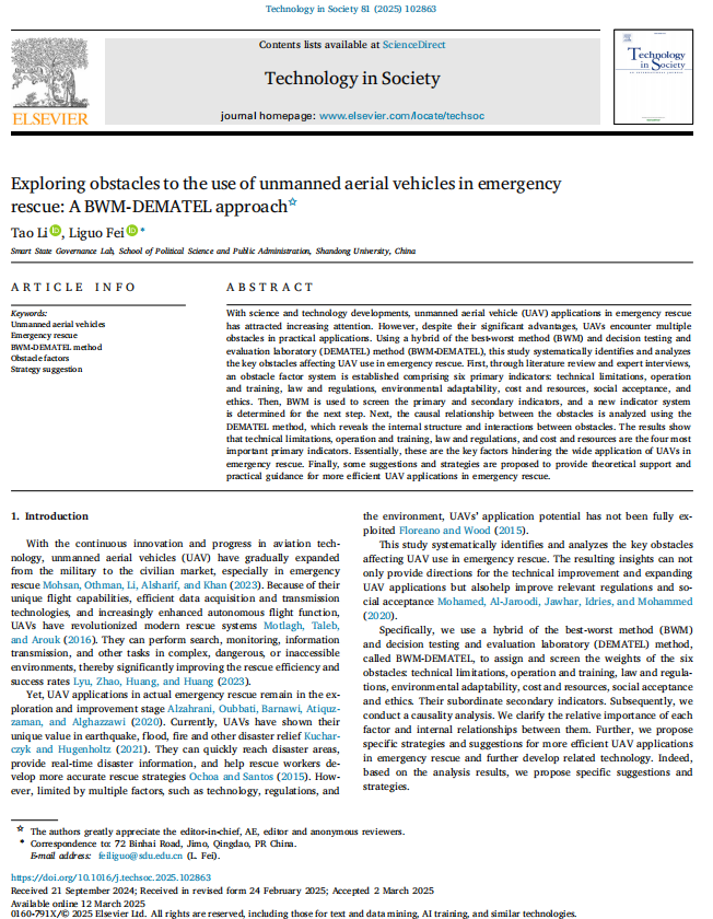 智慧国家治理实验室费立国副研究员团队在SSCI中科院一区TOP期刊《Technology in Society》上发表了题为《Exploring obstacles to the use of unmanned aerial vehicles in emergency rescue: A BWM-DEMATEL approach》的论文,该期刊的最新影响因子为10.1。研究探讨了BWM‐DEMATEL方法在无人机应急救援中的应用,特别是在揭示多重障碍因素间因果关系以及应对技术局限、操作培训、法规约束与成本资源等挑战时的优势。论文构建了涵盖技术限制、操作与培训、法律法规、环境适应性、成本与资源以及社会接受与伦理等维度的障碍指标体系,通过BWM方法筛选关键指标,再利用DEMATEL方法解析各因素间的相互作用,明确了技术限制、操作培训、法律法规和成本资源为无人机在应急救援中应用的核心障碍。该研究为无人机应急救援提供了新的理论框架和决策支持,同时为未来技术改进与政策制定指明了方向。av视频