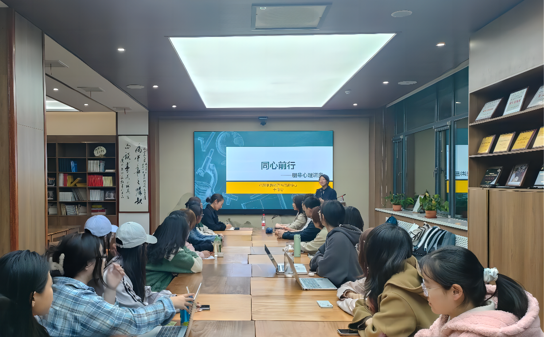 在新时代美德书屋举办“同心前行——朋辈心理讲座”心理骨干专题培训。本次培训特邀青岛校区心理健康教育与咨询中心于路心老师担任主讲,学院心理委员及宿舍长代表参加学习。