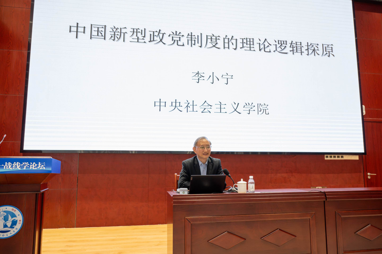 统一战线学博士生导师李小宁在主旨报告中指出,中国新型政党制度理论逻辑的起点是阶级斗争和无产阶级专政学说,本原是由“阶级联盟”构成的“人民”。对“人的根本”即“个人与社会”关系的解答是“人民本位”,在此基础上建立了“人民民主专政”的国家政治制度,与这个国家政治制度相适应的政党制度就是中国新型政党制度,中国共产党是这套理论及制度的缔造者。