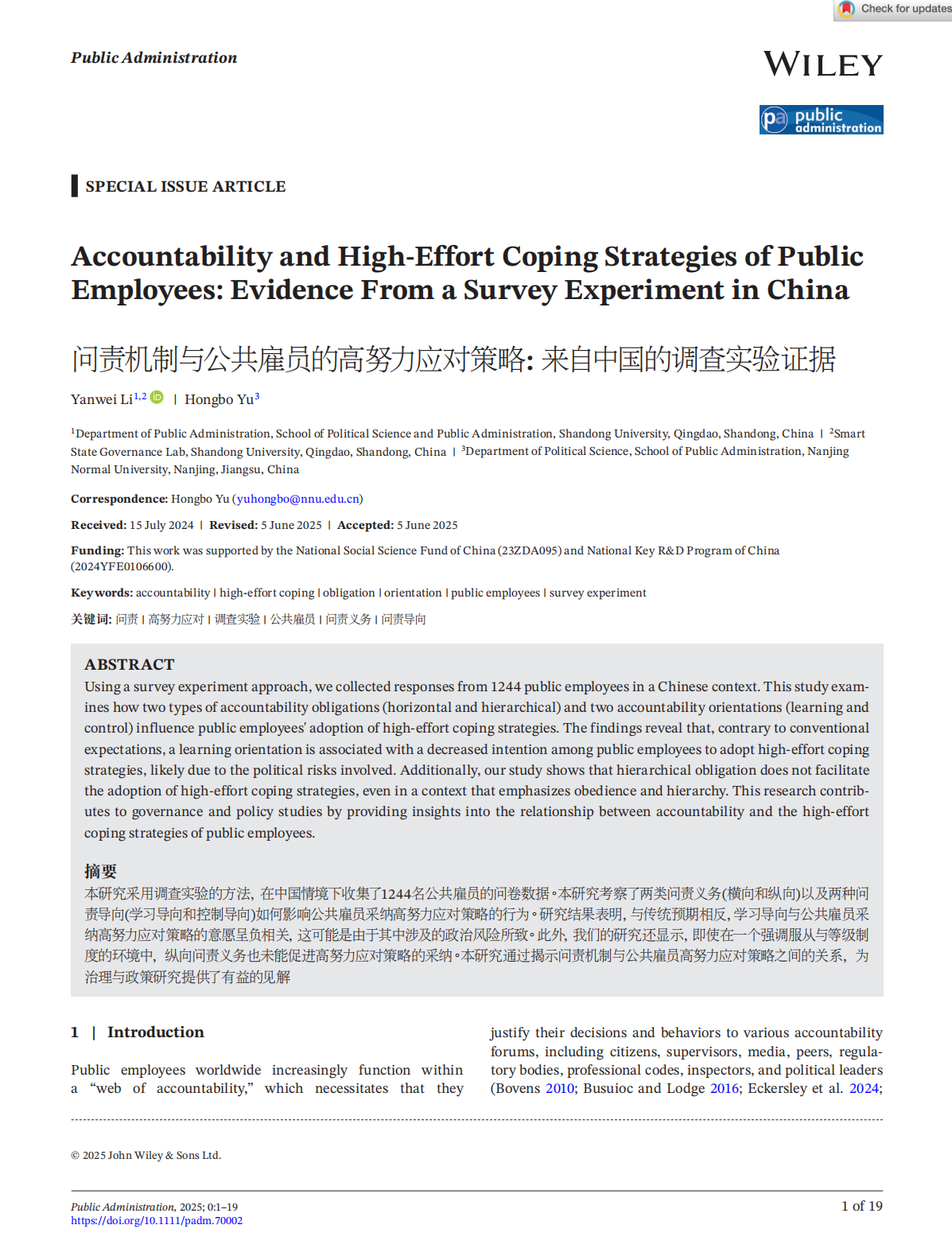 李延伟教授作为第一作者在公共管理顶级期刊Public Administration(PA)在线发表题为《Accountability and High-Effort Coping Strategies of Public Employees: Evidence From a Survey Experiment in China》的学术论文。
