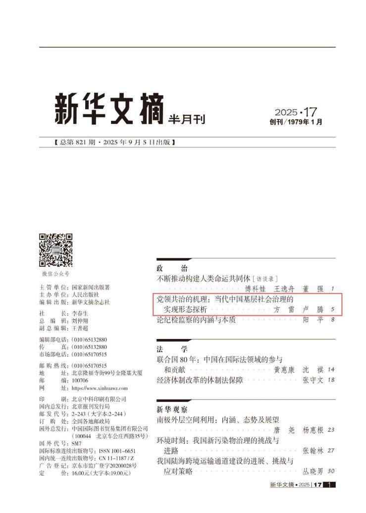 、当代社会主义研究所方雷教授团队发表于《治理研究》2025年第2期的《党领共治的机理:当代中国基层社会治理的实现形态探析》一文被《新华文摘》2025年第17期全文转载。