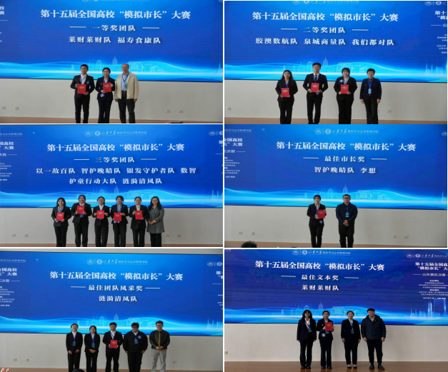 的“莱财莱财”团队、“福寿食康”团队获得一等奖;青岛大学的“胶澳数航”等3支团队获得二等奖;青岛大学的“以一敌百”等5支团队获得三等奖;“莱财莱财”团队获得最佳文本奖;“涟漪清风”团队获得最佳团队风采奖;“智护晚晴”团队的李想同学获得最佳市长奖。