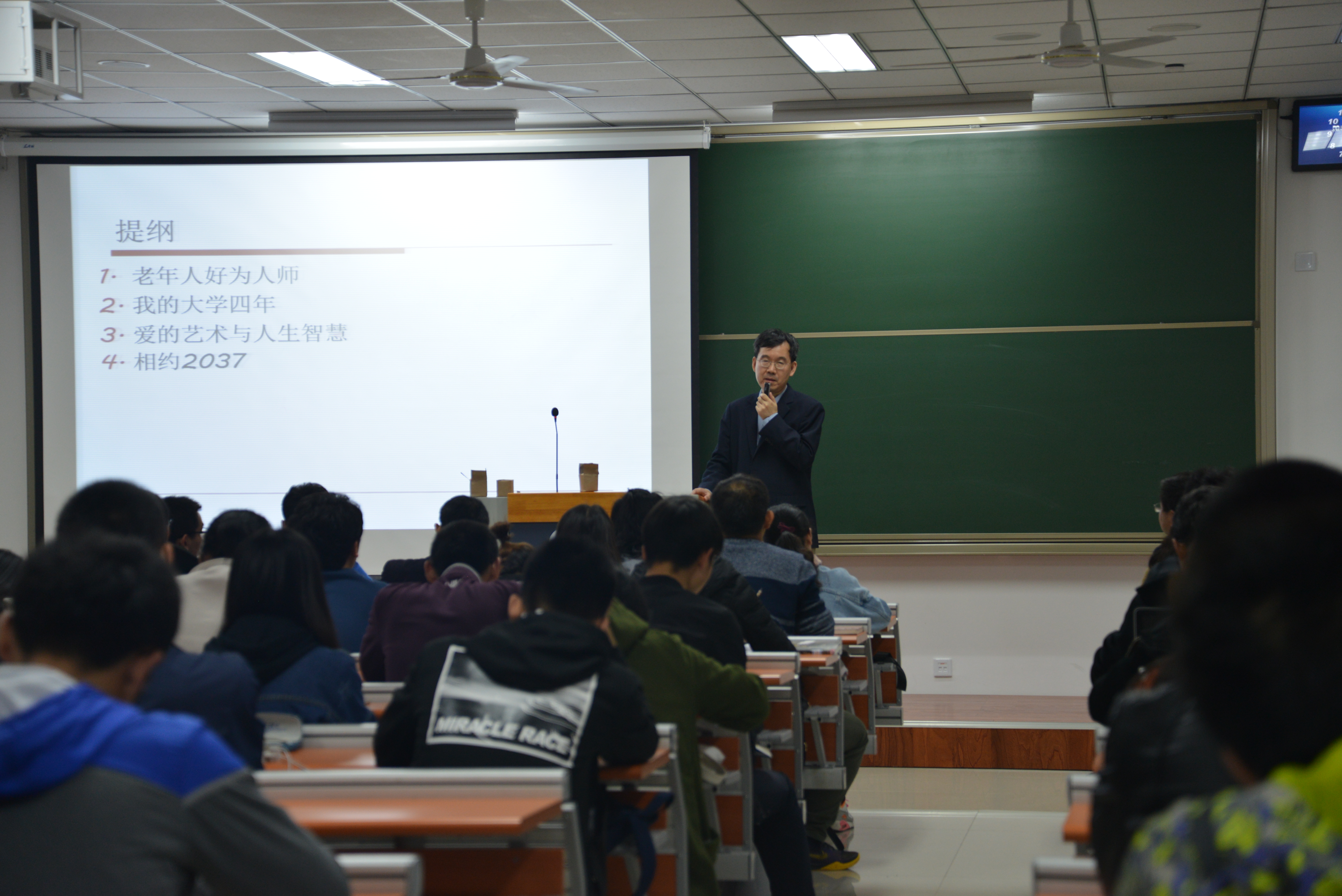 李连江教授从老年人好为人师的特点、自身大学四年经历体会、爱的艺术与人生智慧、与同学们相约二十年后见等四个方面深入浅出地阐述了珍惜时光、充实人生的哲理性主题。李教授提出,年轻人不应该对前人的经验偏听偏信,他鼓励大学生勇敢尝试,去体验自己的人生。提及他大学四年的经历时,他介绍了自己从初入校门的敬畏,到离校时意识到对母校的归属感和决心回校的心路历程,激发了同学们对未来的期许。此外,他还从珍惜师友情、创造力和生命力、人情练达的利弊、应有与应得、健康人生等多个角度,为同学们解开了学术研究、交友情感、艺术欣赏与人生智慧多方面的疑惑。之后,李教授与同学们相约二十年后再会,在校时,让母校否定并丰富自我;离校后,用新我否定并荣耀母校。
