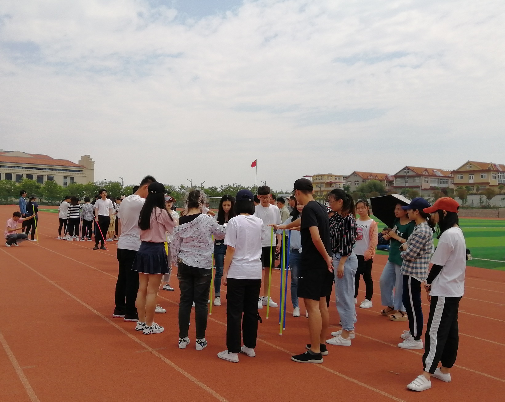 第一轮为不倒森林,十二名同学每人手拿一根杆,用掌心按住一端,将其直立在地面上,并围成一个圆圈,根据口号迅速松开自己手中的杆子向前移动,按住下一名同学之前按住的杆子,在同学们努力练习、团结一致、配合默契之下,最终以小组第一的成绩获得胜利。